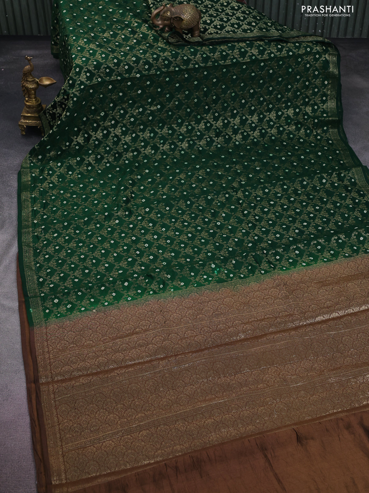 Chiniya silk saree green and brown with allover zari weaves & bandhini prints and zari woven border