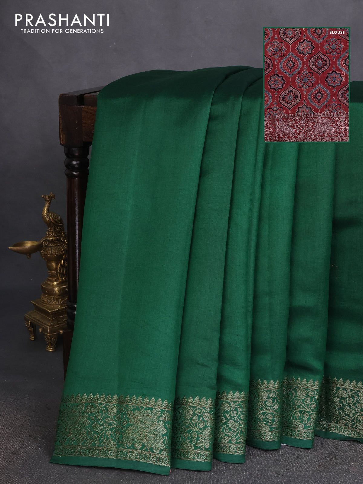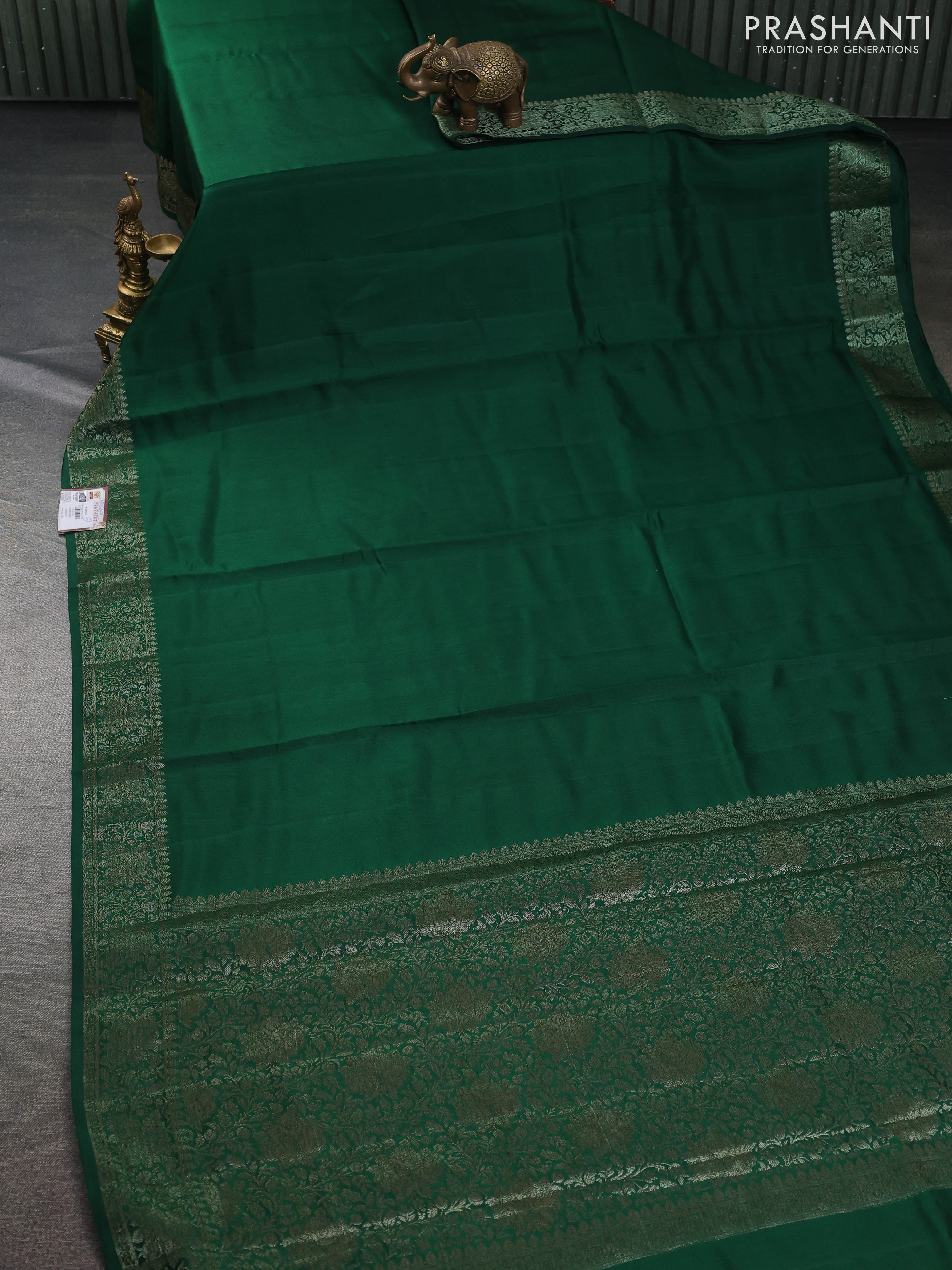 Chiniya silk saree green and maroon with plain body and woven border