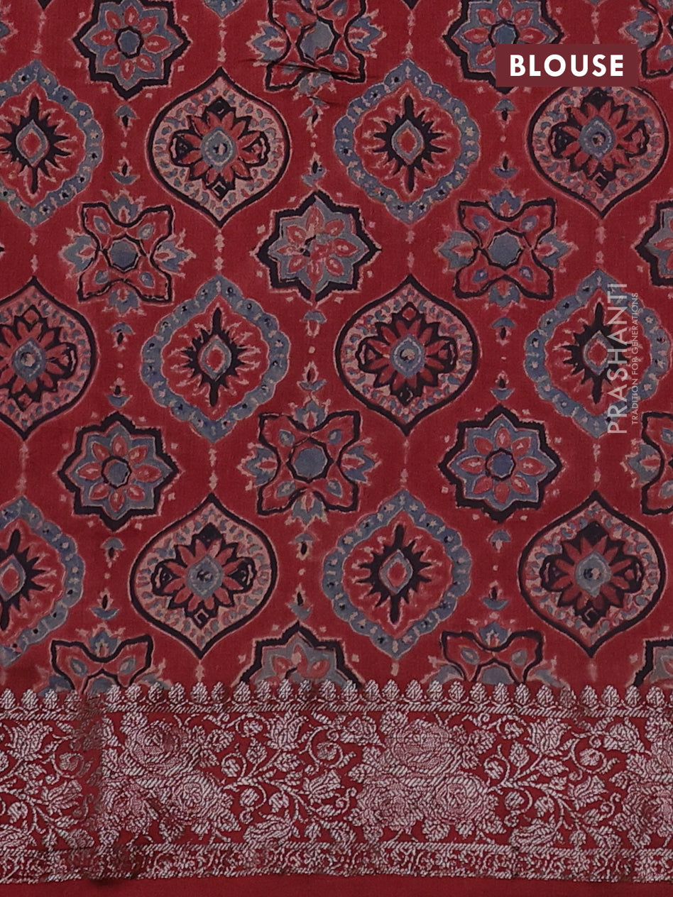 Material : Chiniya Silk SILK MARK CERTIFIED Blouse : Ajrakh printed blouse Length of saree : 6.2 mts (5.5 mts... Read more