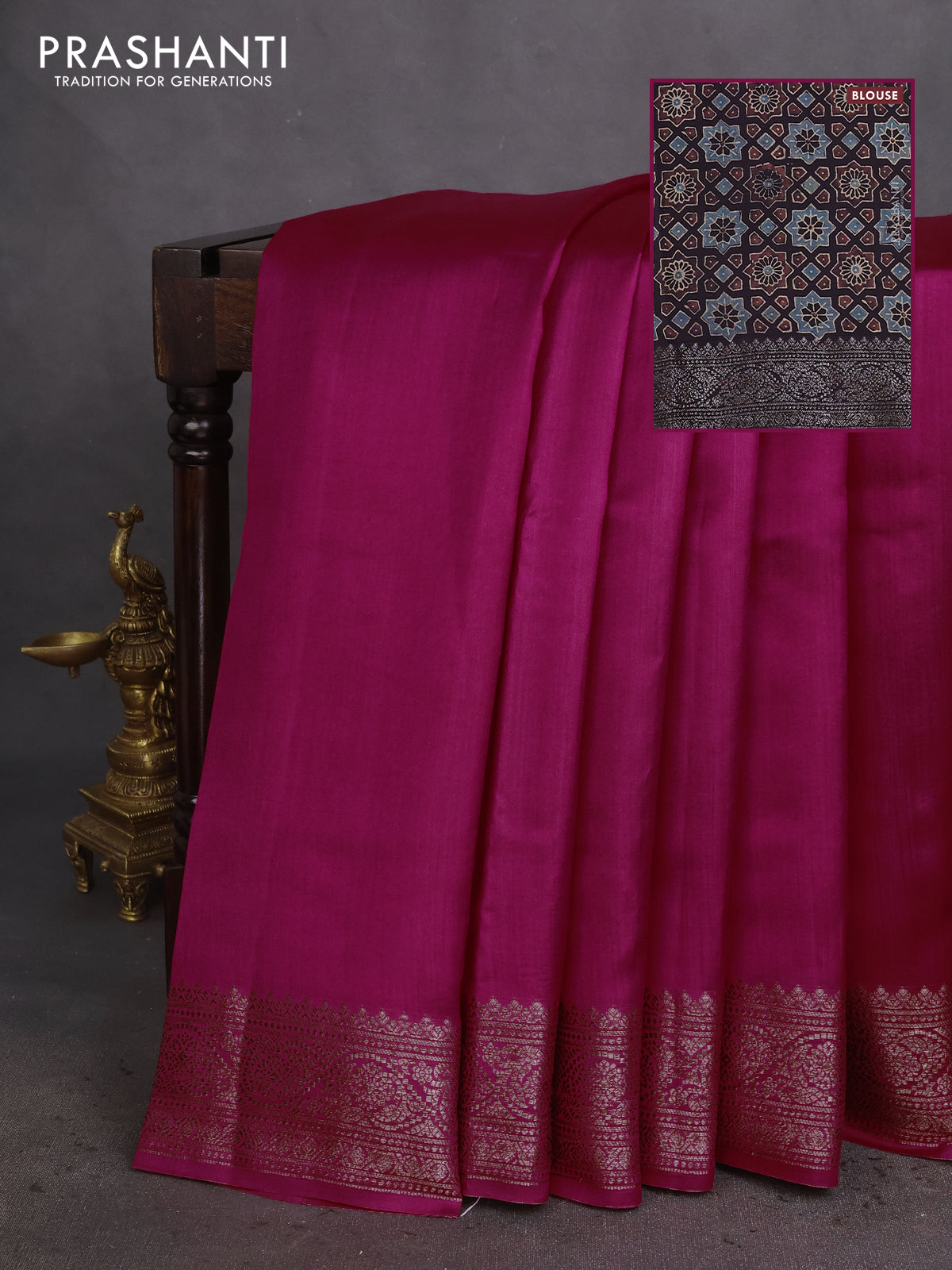 Chiniya silk saree magenta pink and deep coffee brown with plain body and woven border