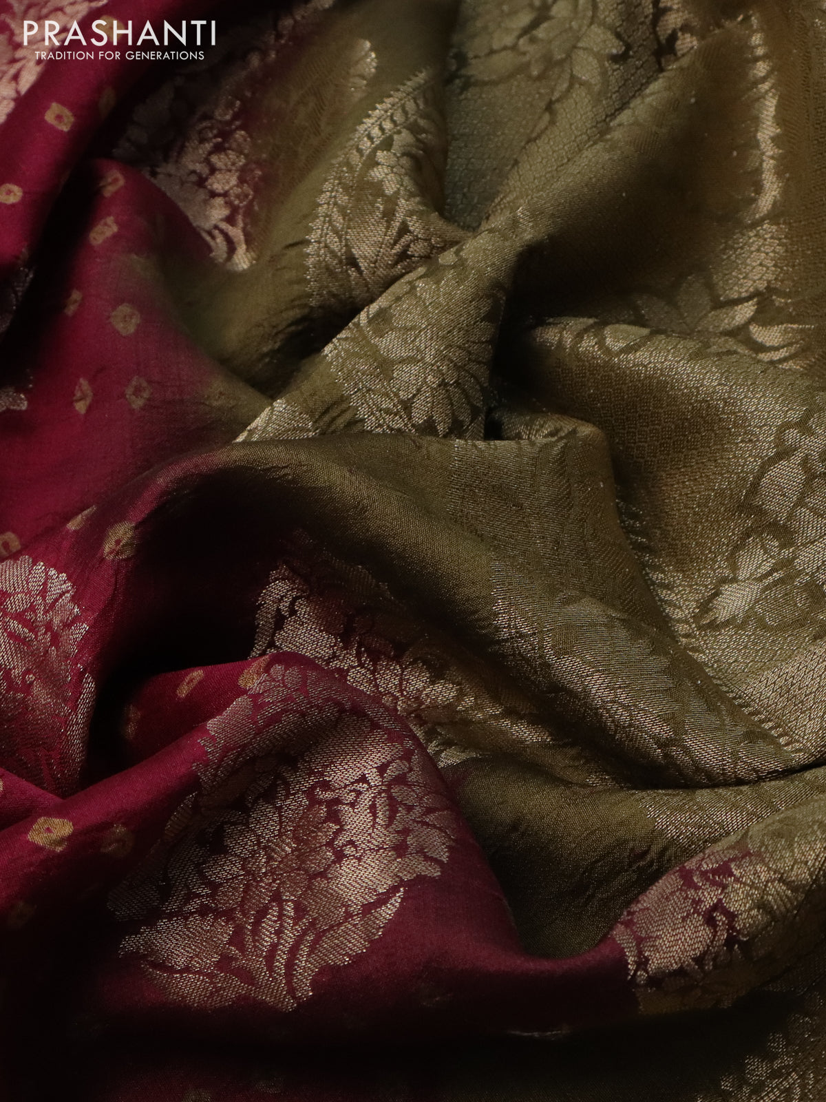 Chiniya silk saree magenta pink and military green with allover zari buttas & bandhini prints and zari woven border