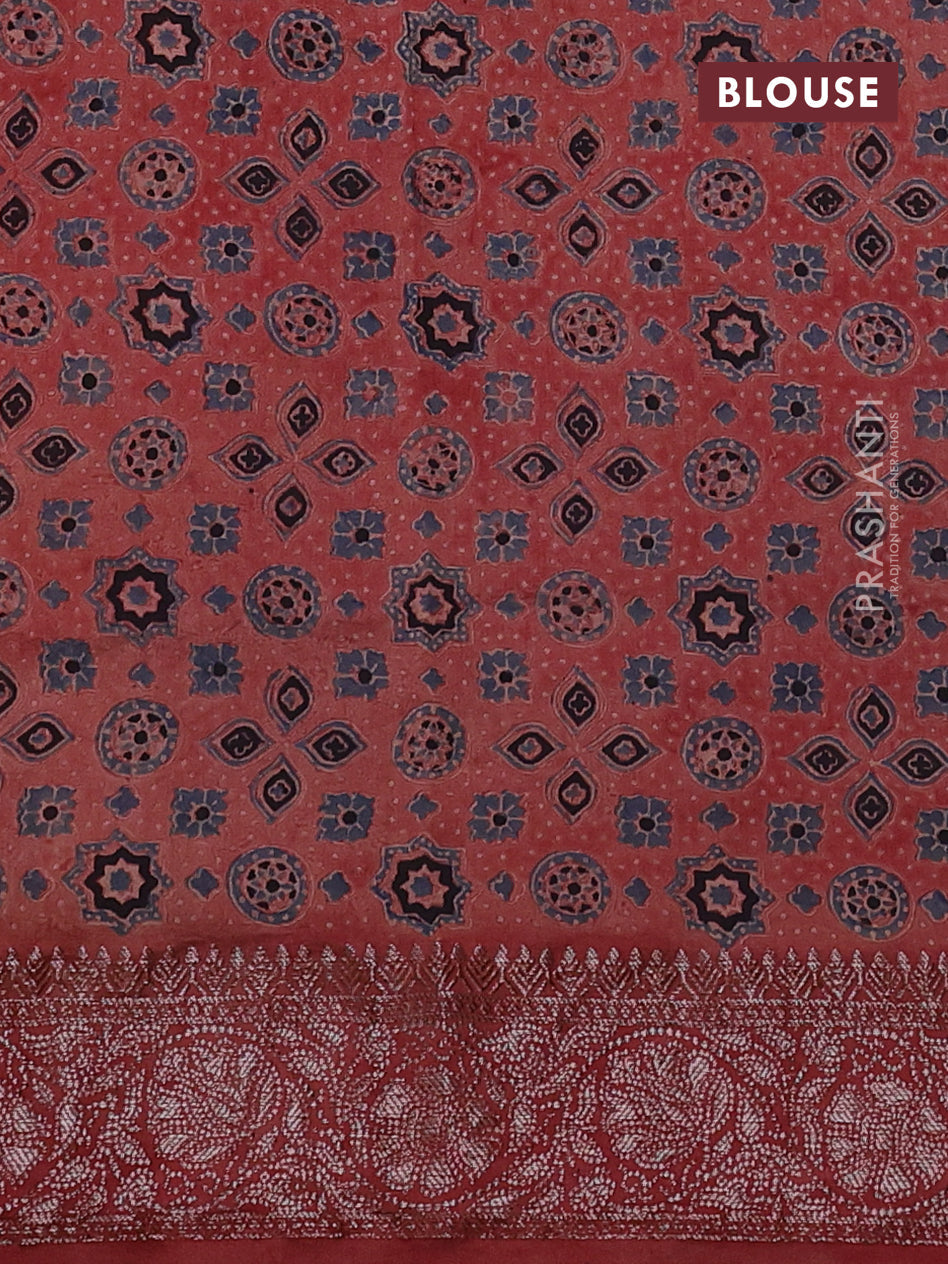 Material : Chiniya Silk SILK MARK CERTIFIED Blouse : Ajrakh printed blouse Length of saree : 6.2 mts (5.5 mts... Read more