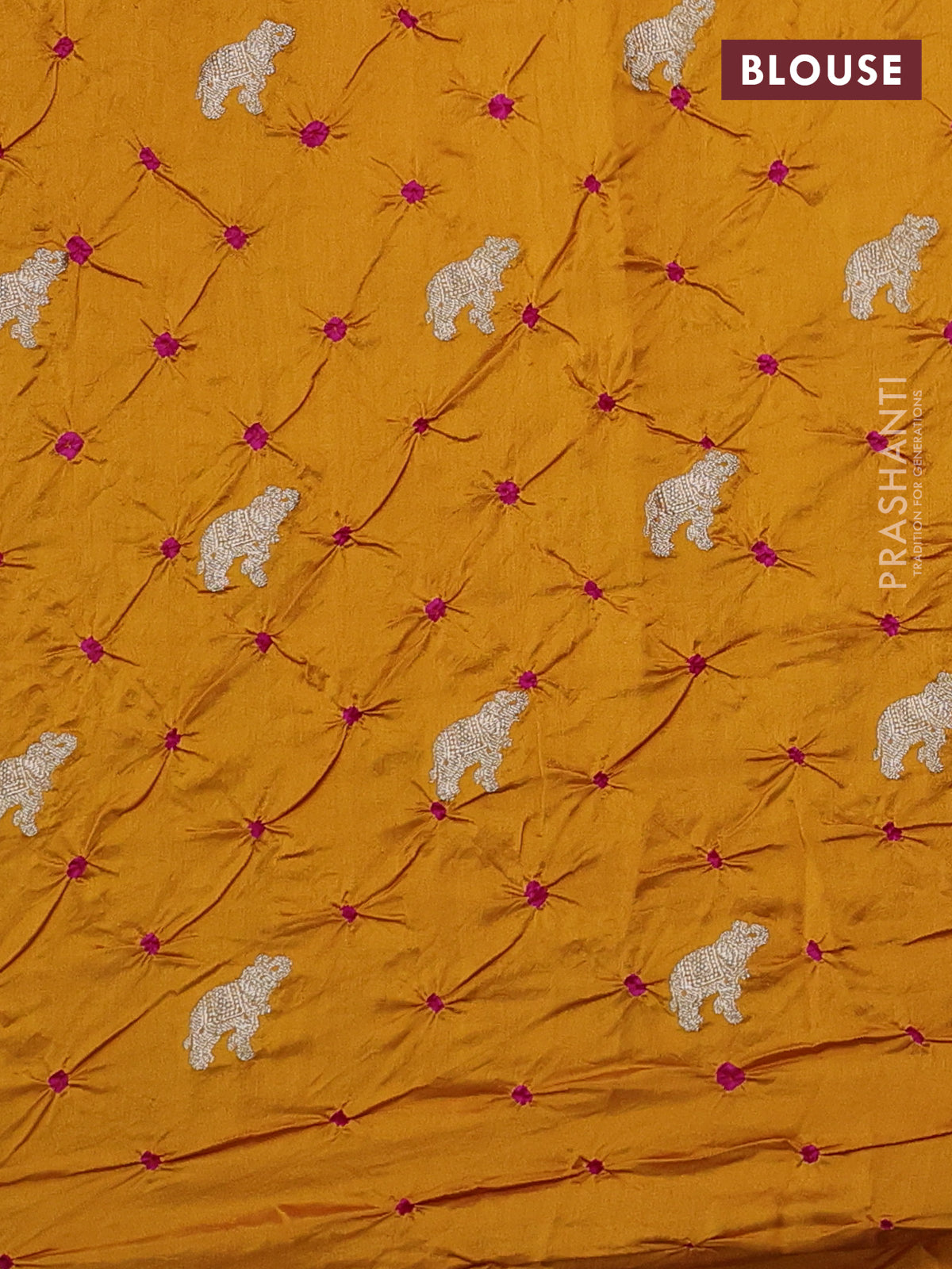 Chiniya silk saree mustard yellow and pink with allover zari buttas & bandhini prints in borderless style