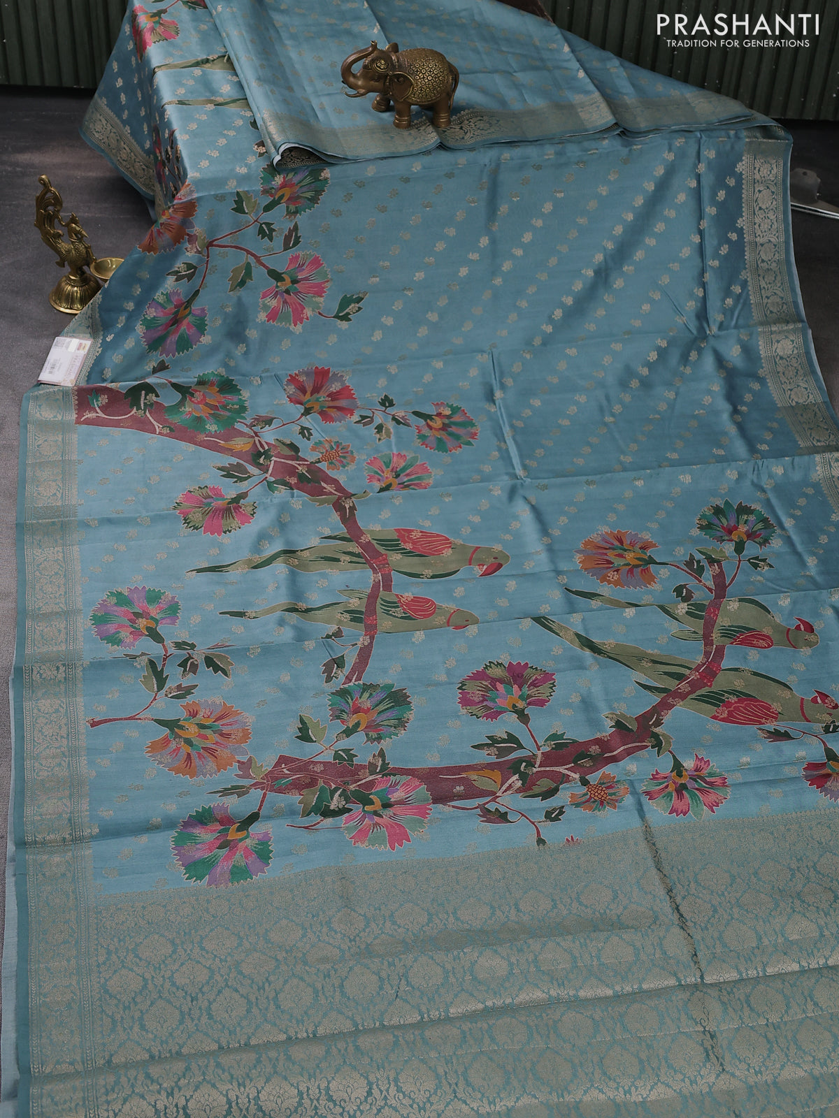 Chiniya silk saree pastel blue with zari woven buttas & digital prints and zari woven border