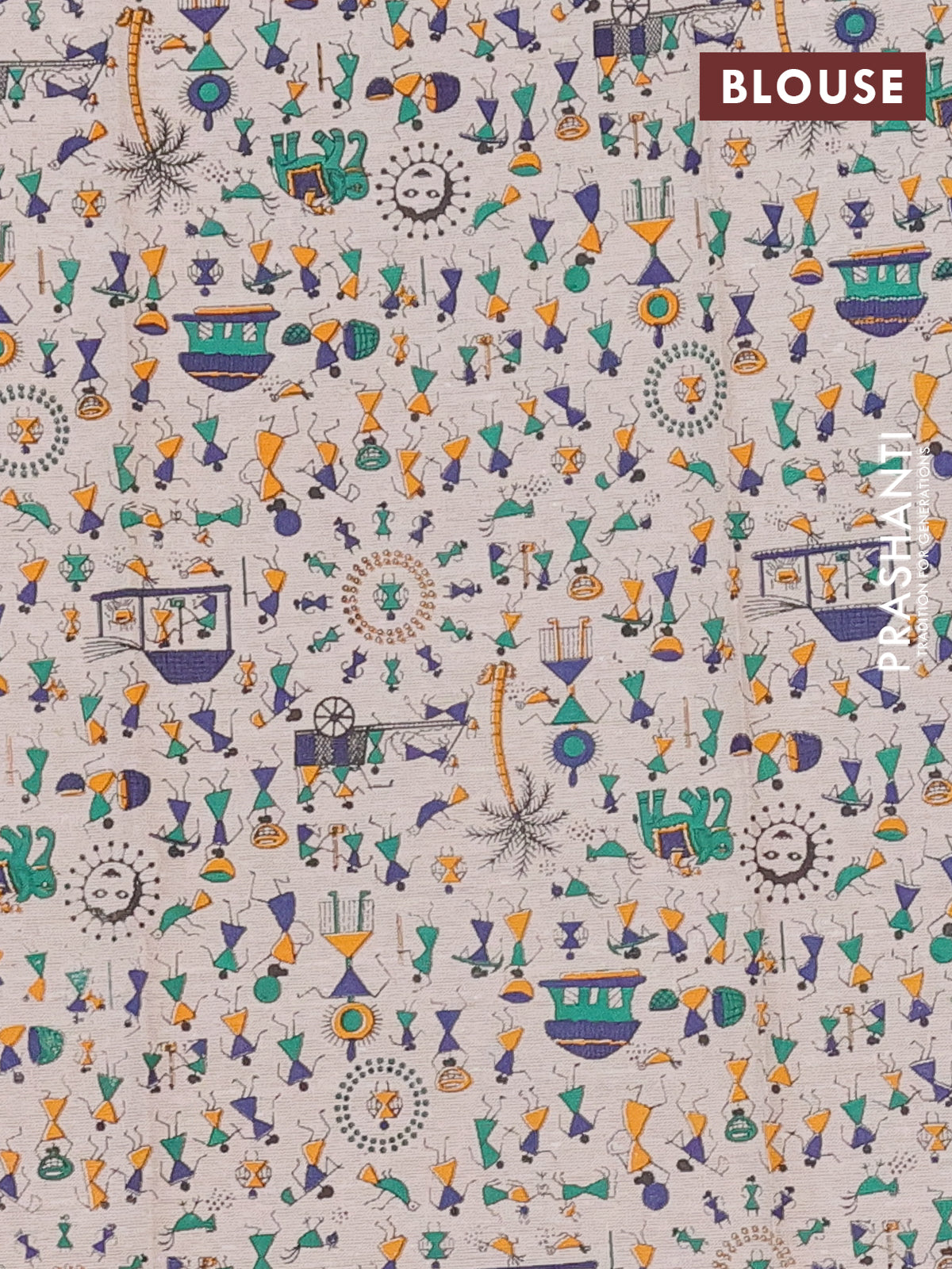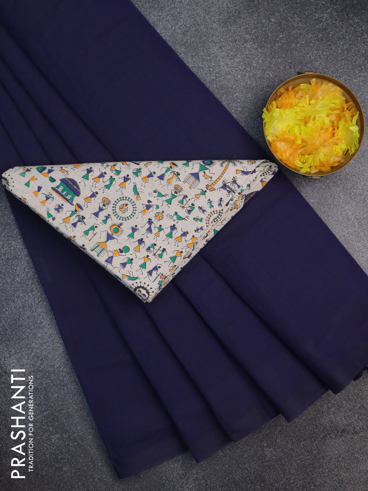 Chirala cotton saree navy blue and beige with plain body and warli prints blouse