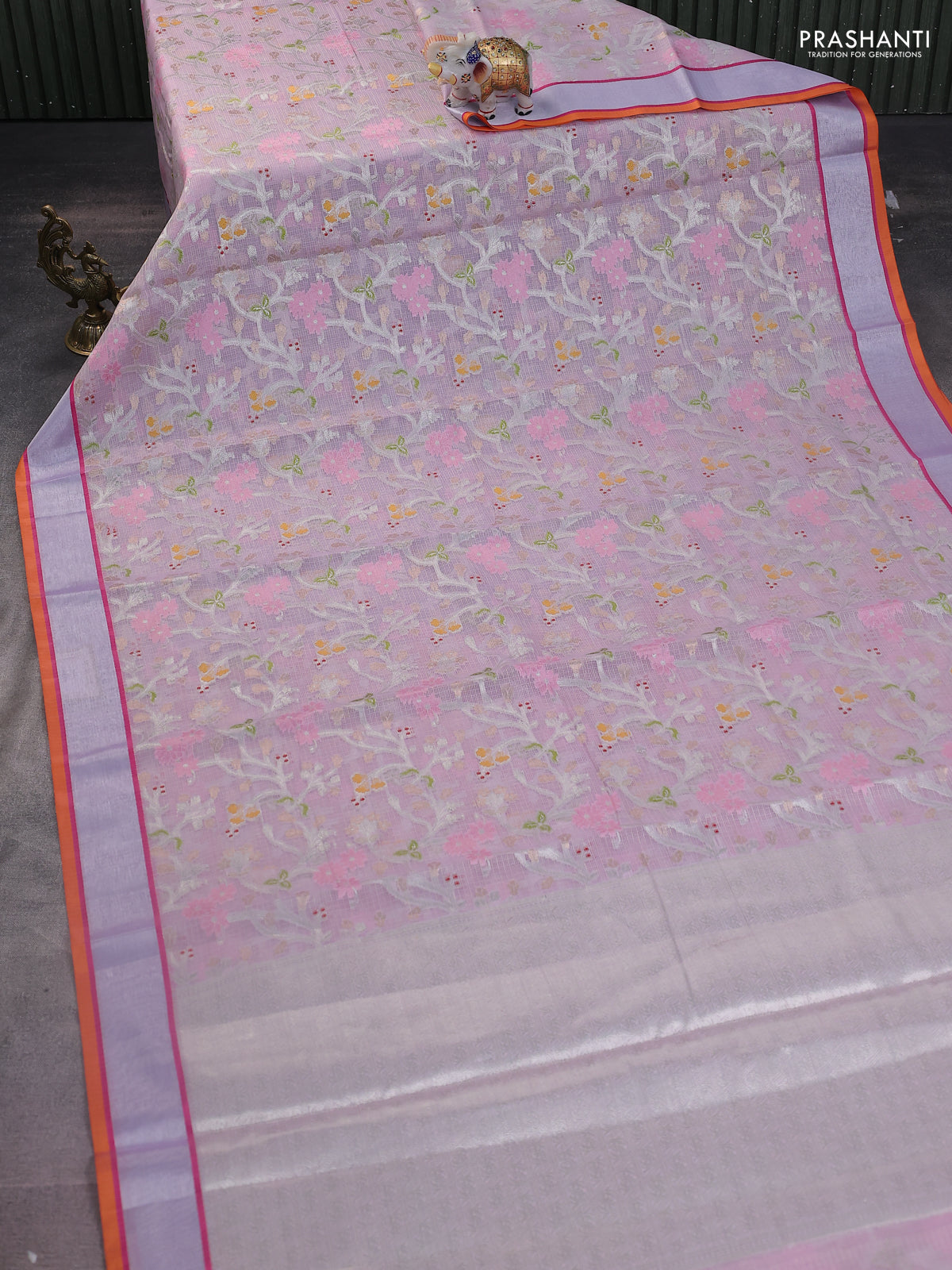 Cotton zari kota saree lavender and orange with allover thread & silver weaves and silver zari woven border