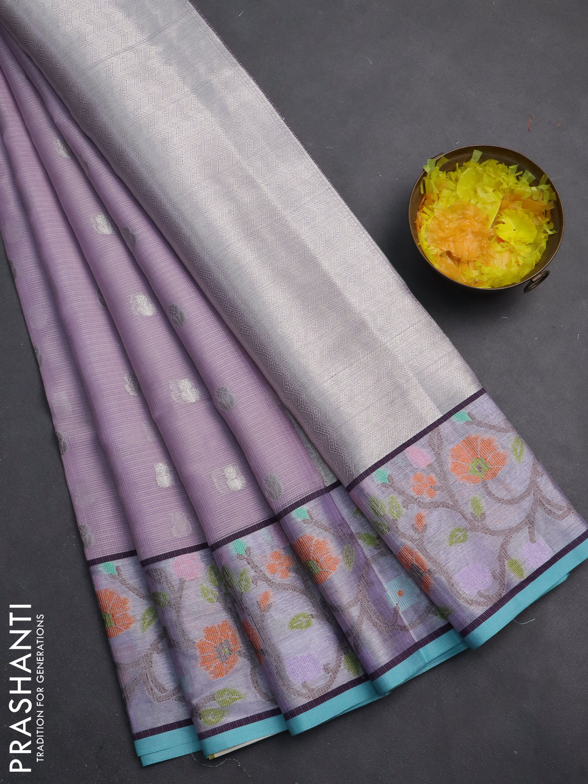 Cotton zari kota saree lavender and teal blue with allover silver zari woven buttas and zari woven paithani border