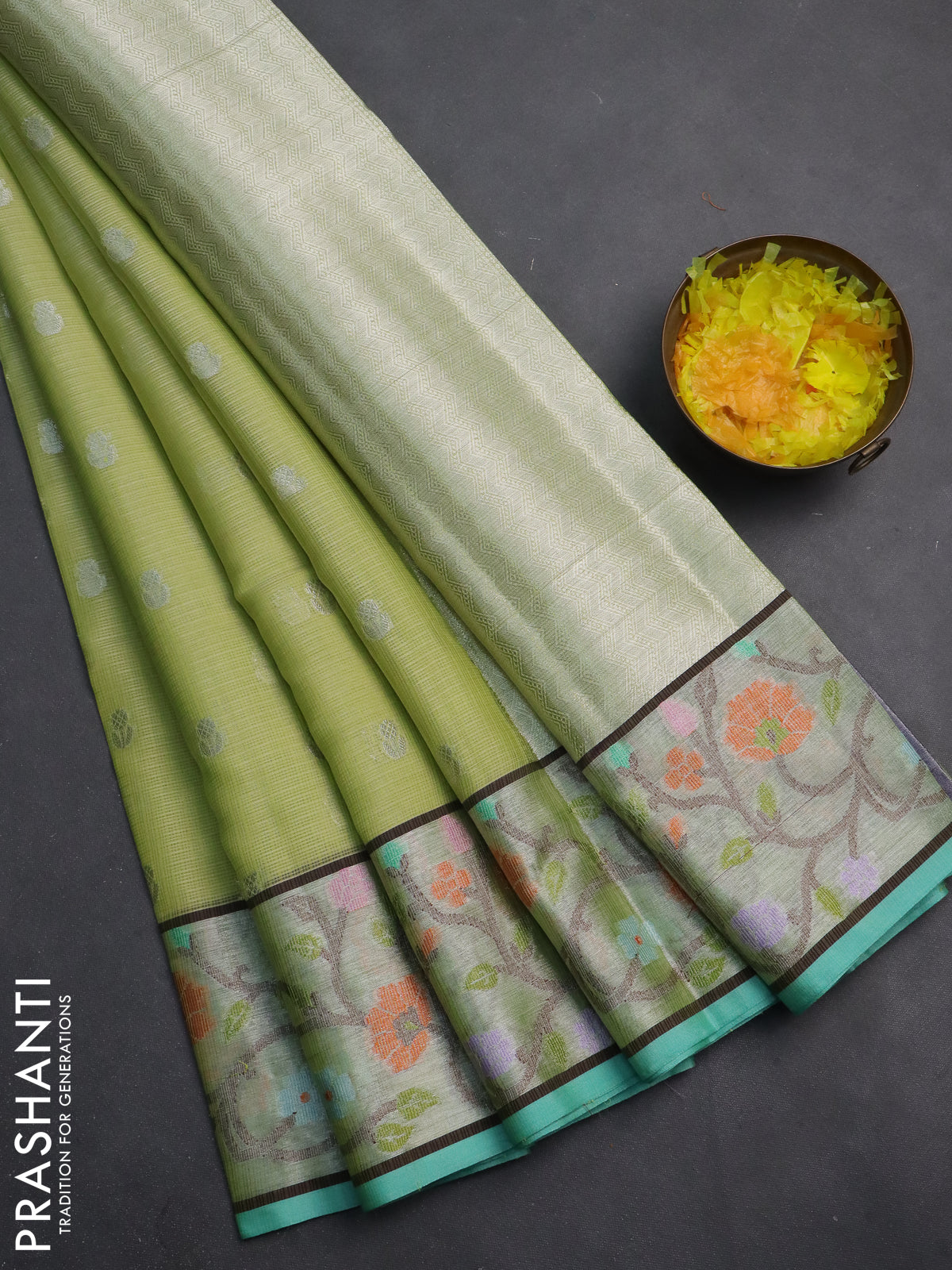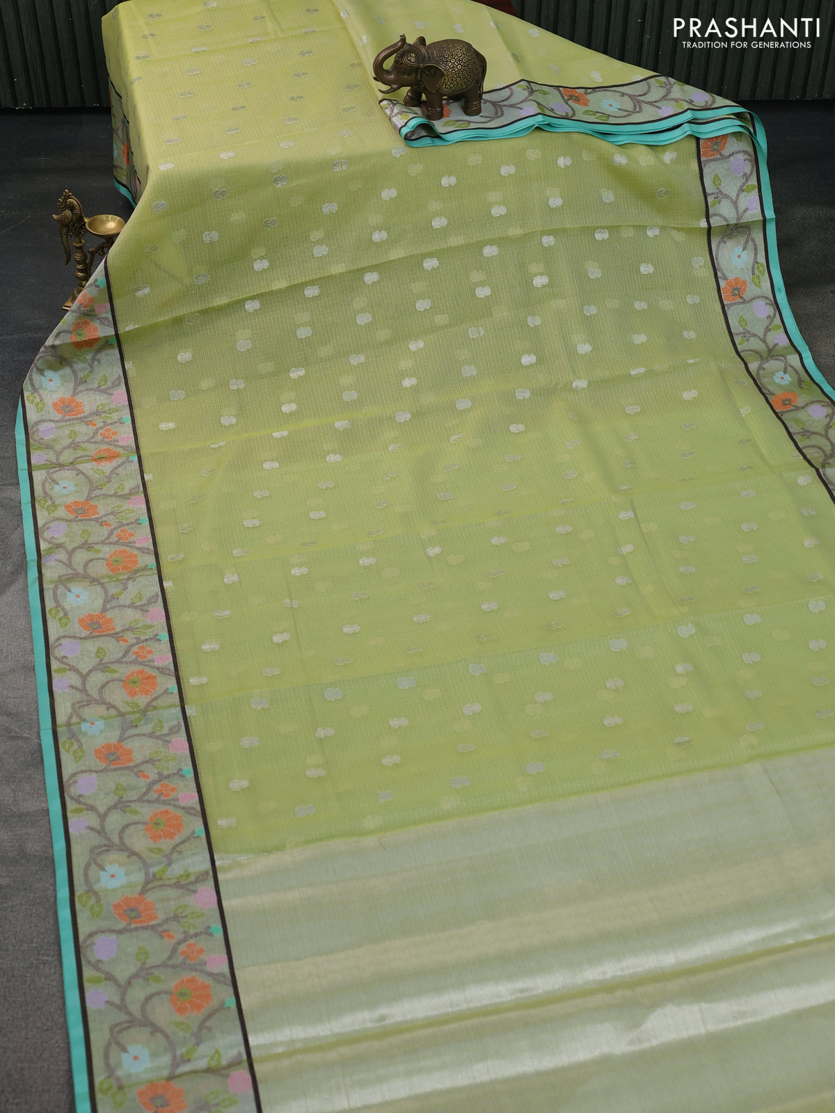 Cotton zari kota saree pista green and teal blue with allover silver zari woven buttas and zari woven paithani border