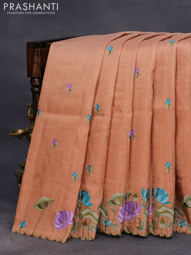 Crushed tissue saree dual shade of bluish gold and pink with plain body and embroidery work border