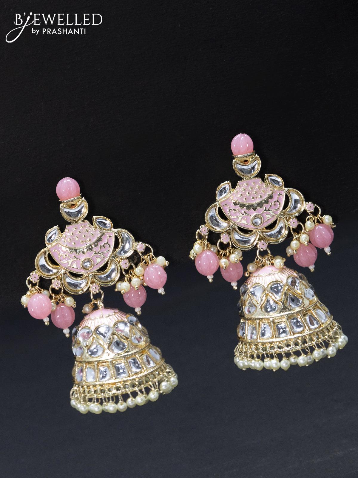 Fashion dangler baby pink jhumkas with kundan stones and pearl hangings