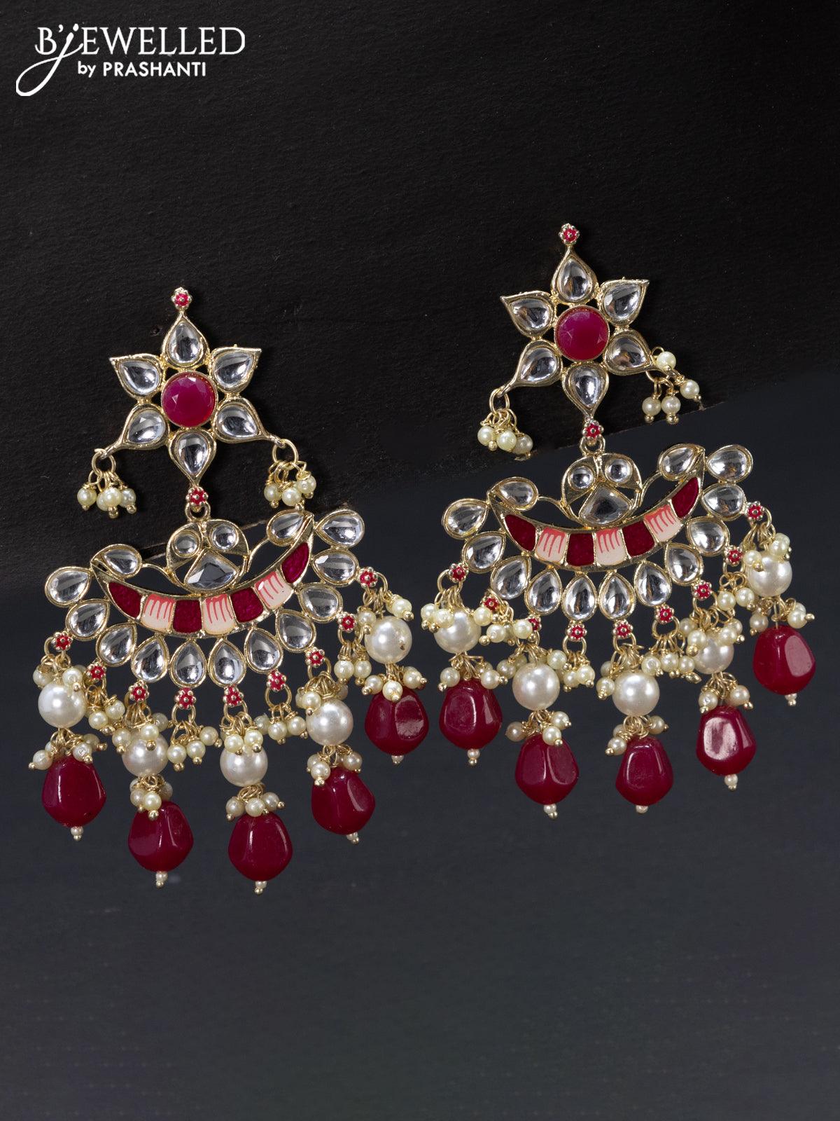 Fashion dangler chandbali dark pink minakari earrings with kundan stones and beads hangings
