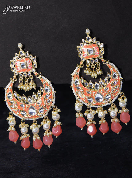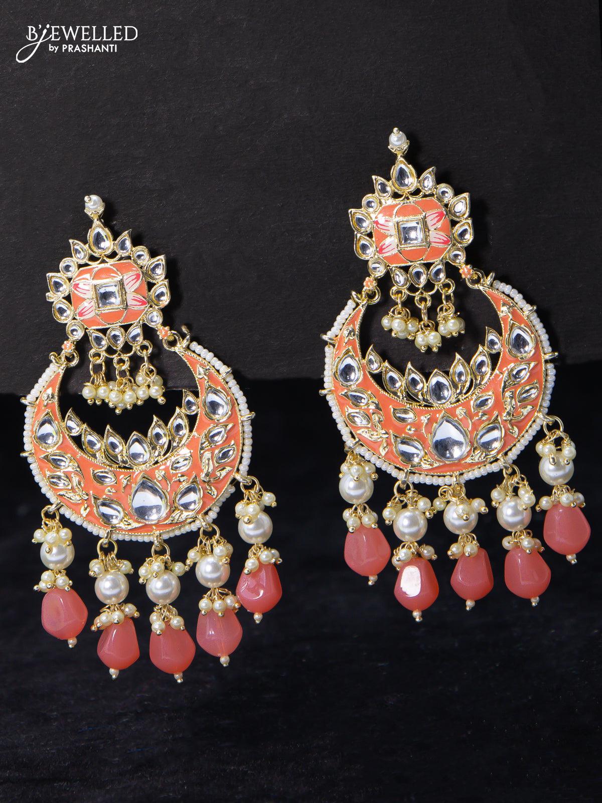 Fashion dangler chandbali earrings peach pink with multicolour beads and pearl hangings