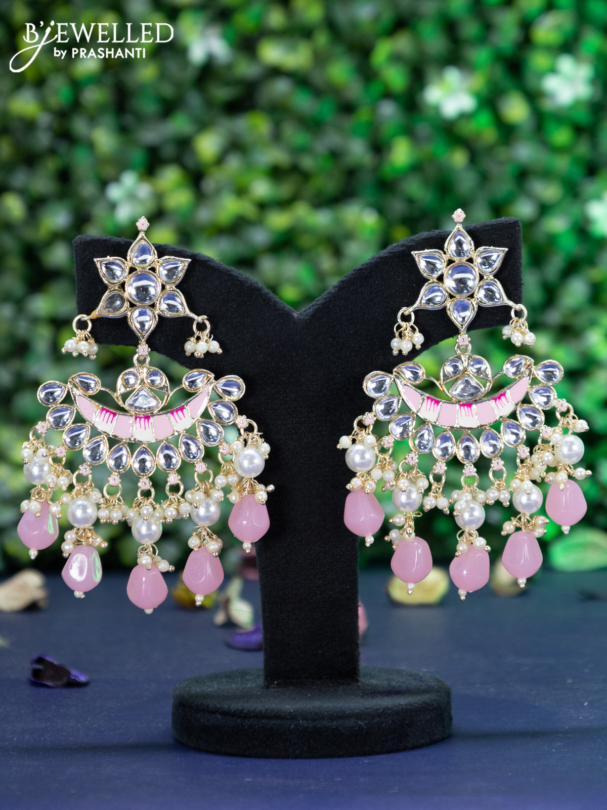 Fashion dangler chandbali pink minakari earrings with kundan stones and beads hanging
