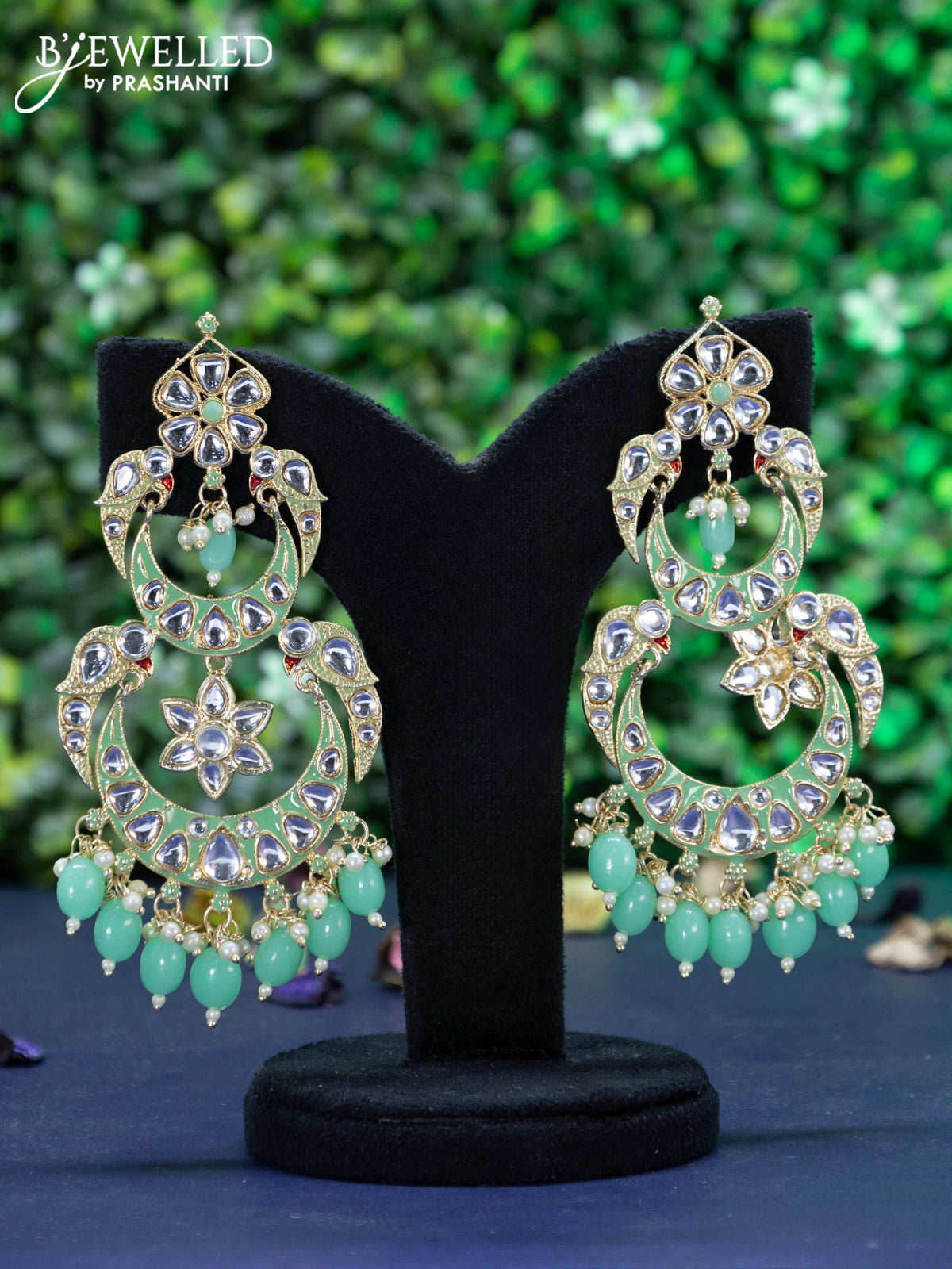 Fashion dangler chandbali teal green minakari earrings with pearl and beads hangings