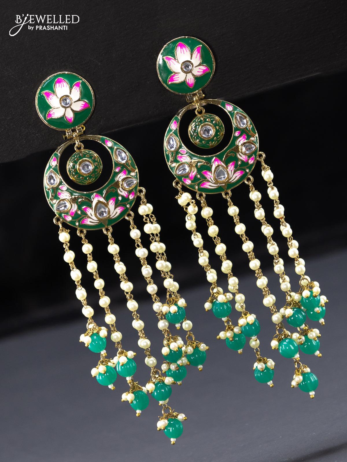 Fashion dangler chandbali teal green minakari earrings with pearl and beads hangings