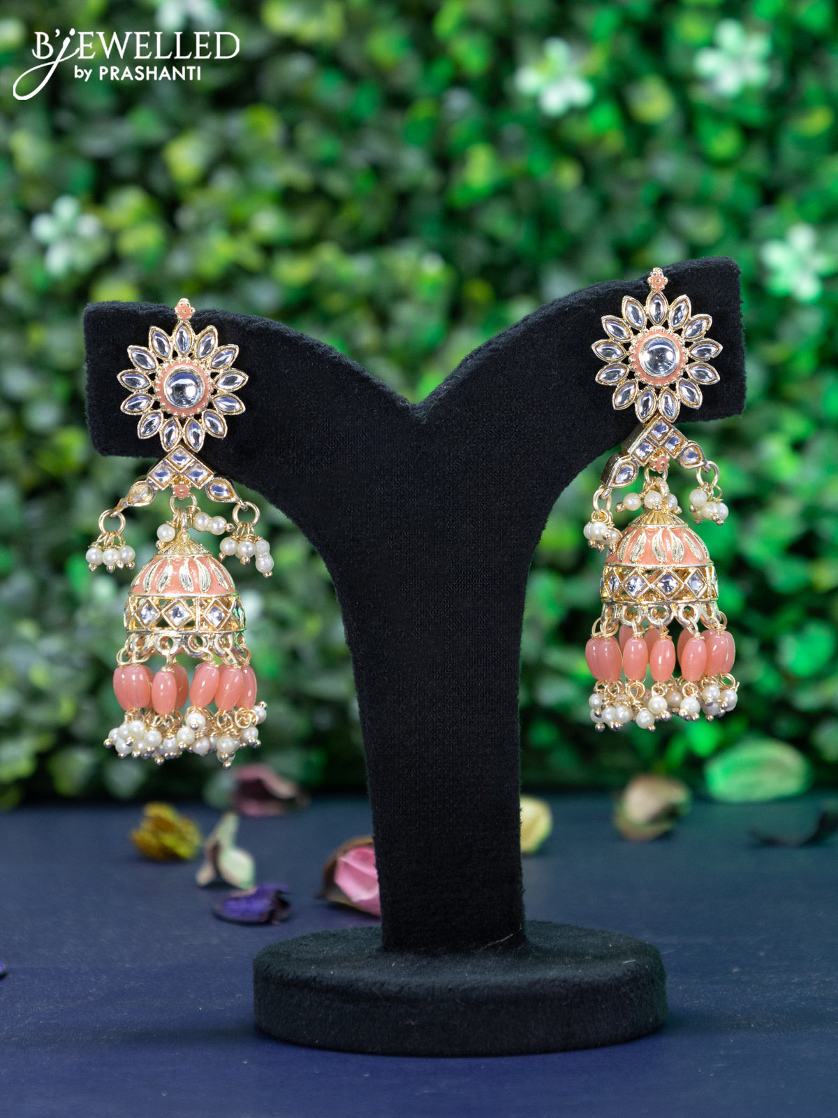 Fashion dangler peach minakari jhumkas with kundan stones and pearl hangings