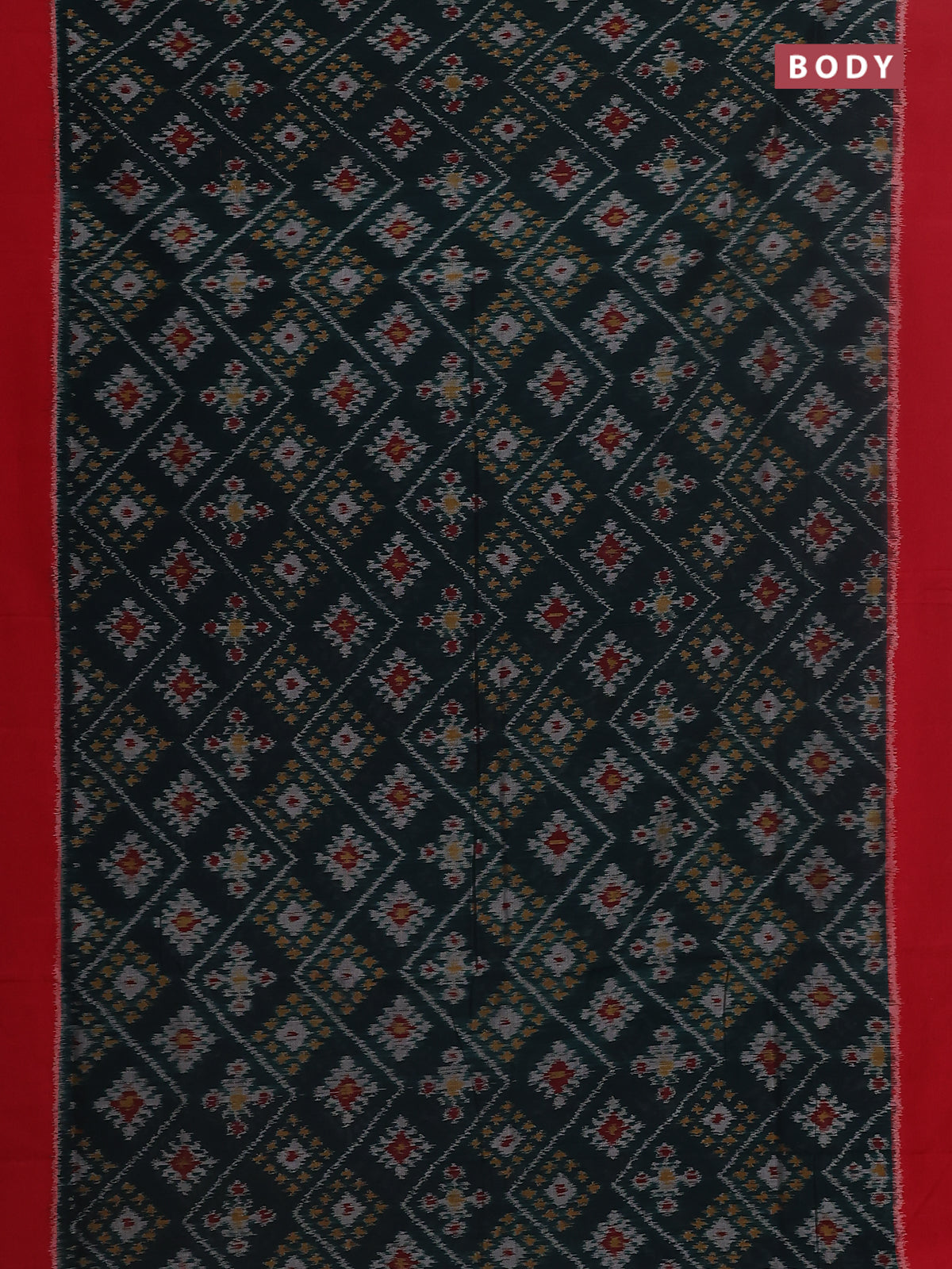 Ikat cotton saree bottel green and red with allover ikat butta weaves and simple border