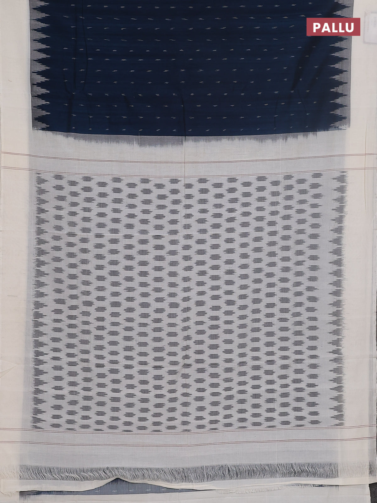 Ikat cotton saree peacock blue and off white with allover ikat butta weaves and temple deision simple border
