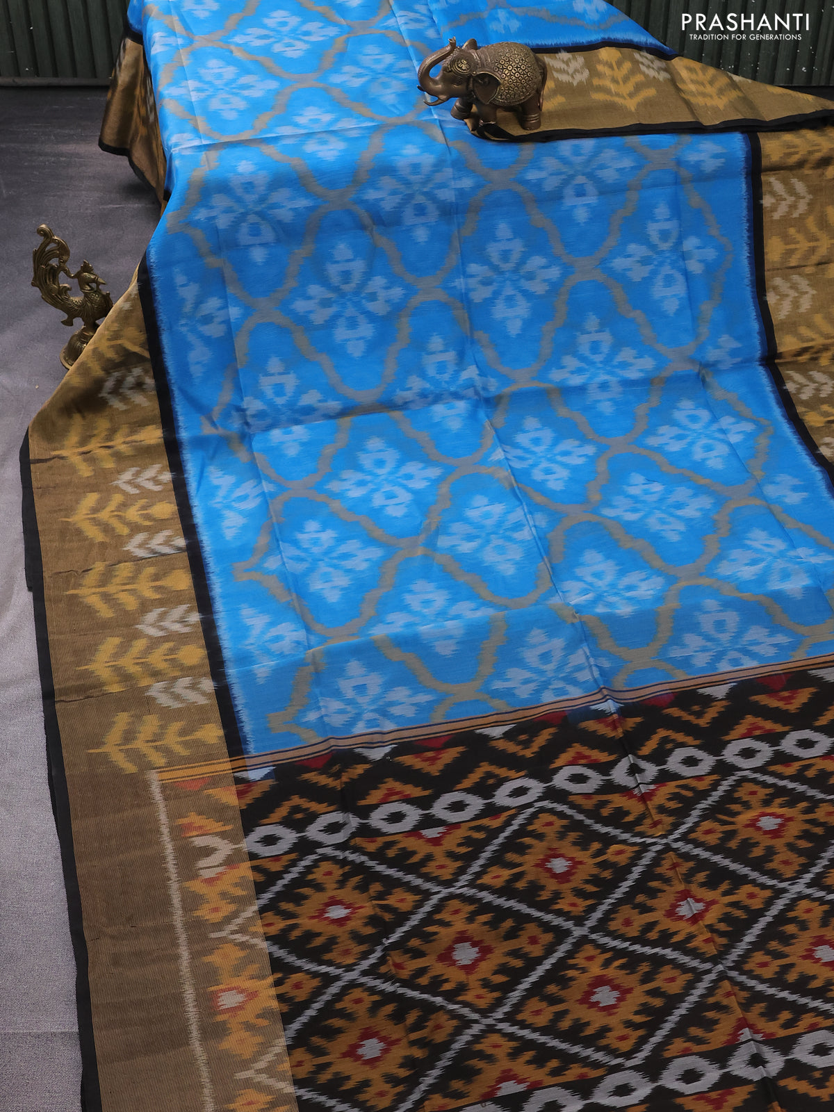 Ikat silk cotton saree blue and black with allover ikat weaves and long ikat woven zari border