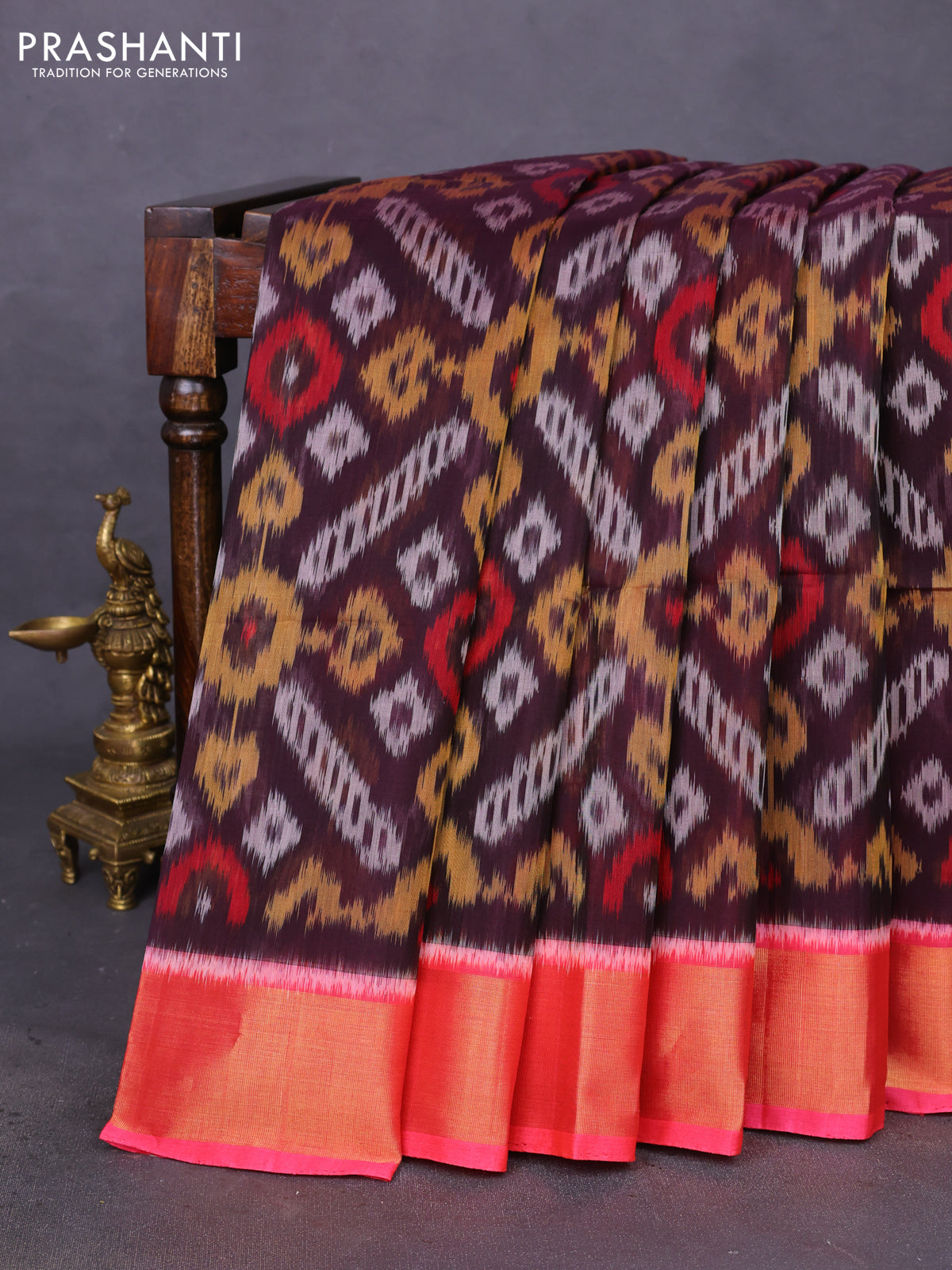 Ikat silk cotton saree coffee brown and peach pink with allover ikat weaves and zari woven border