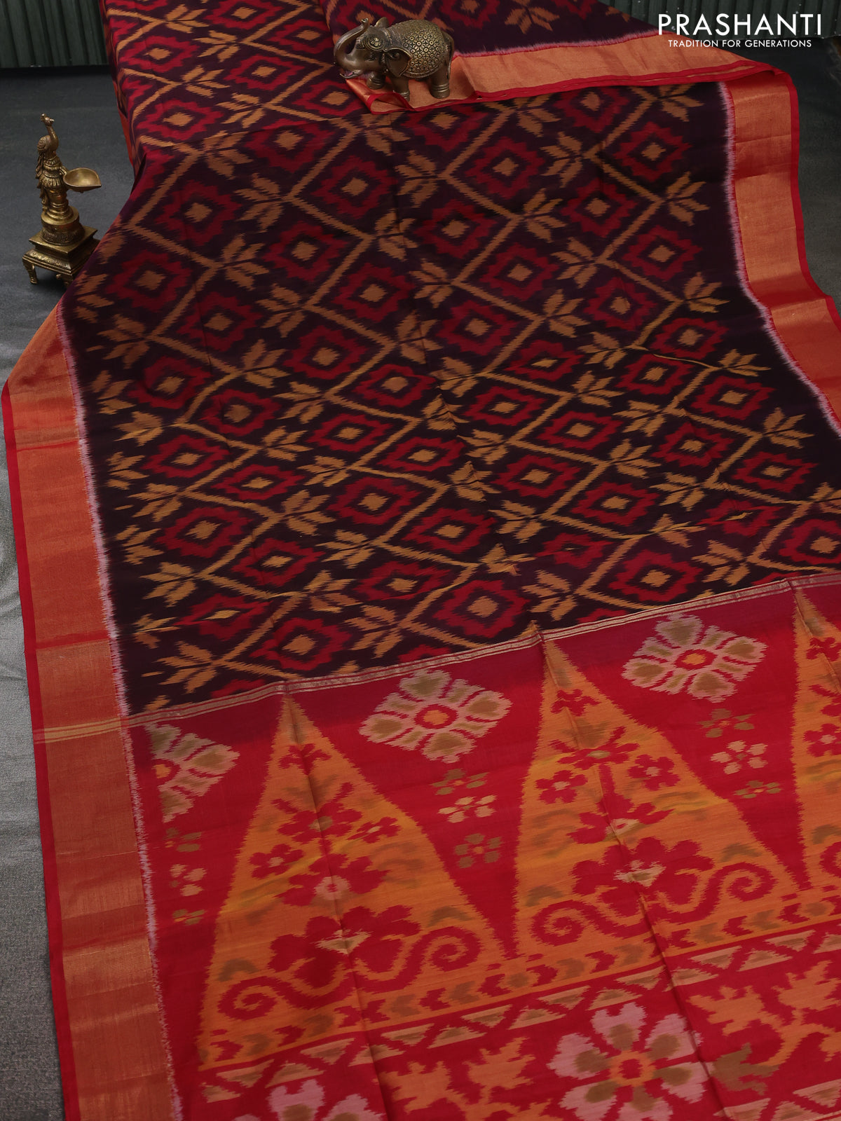 Ikat silk cotton saree coffee brown and red with allover ikat weaves and zari woven border