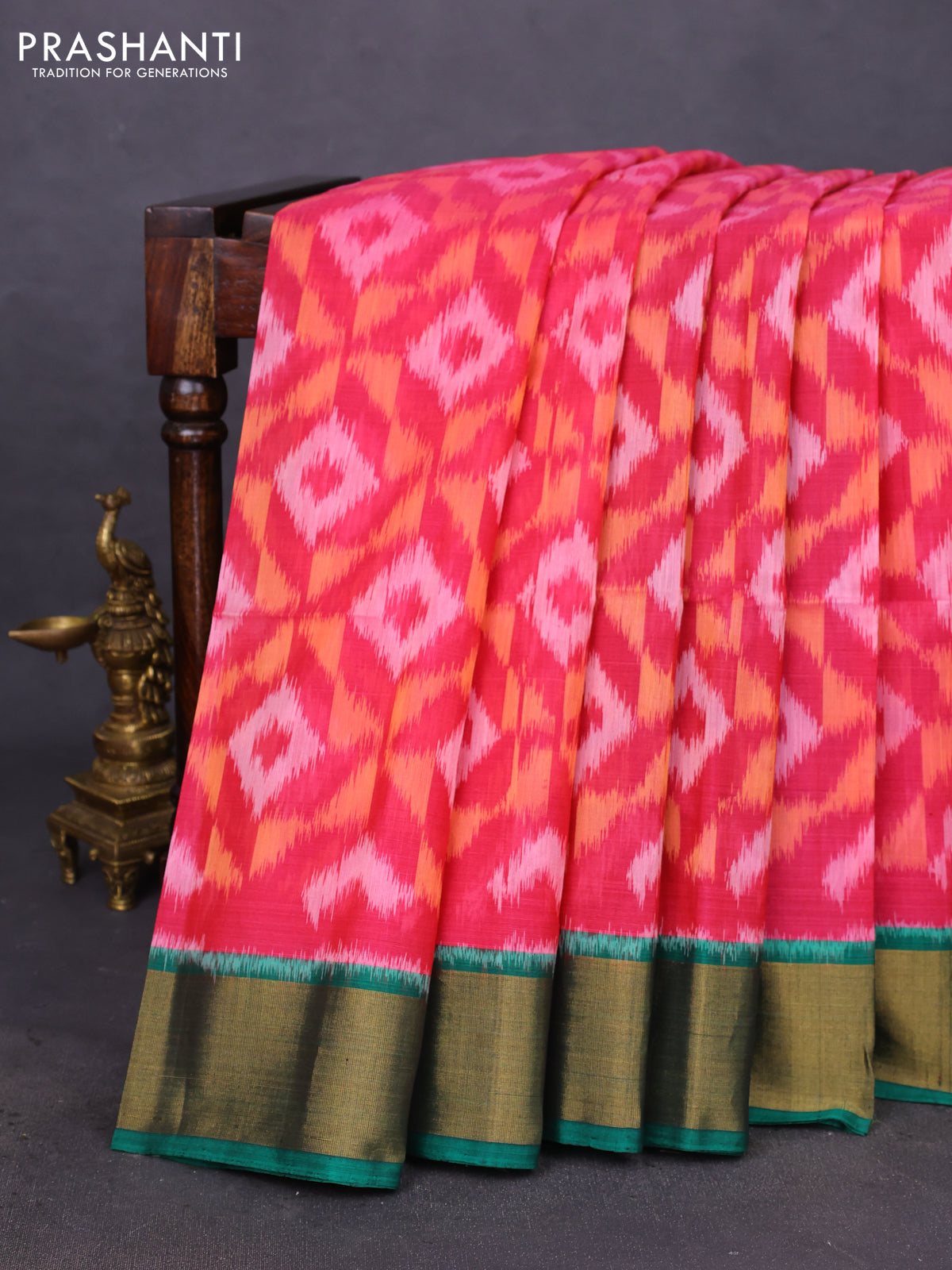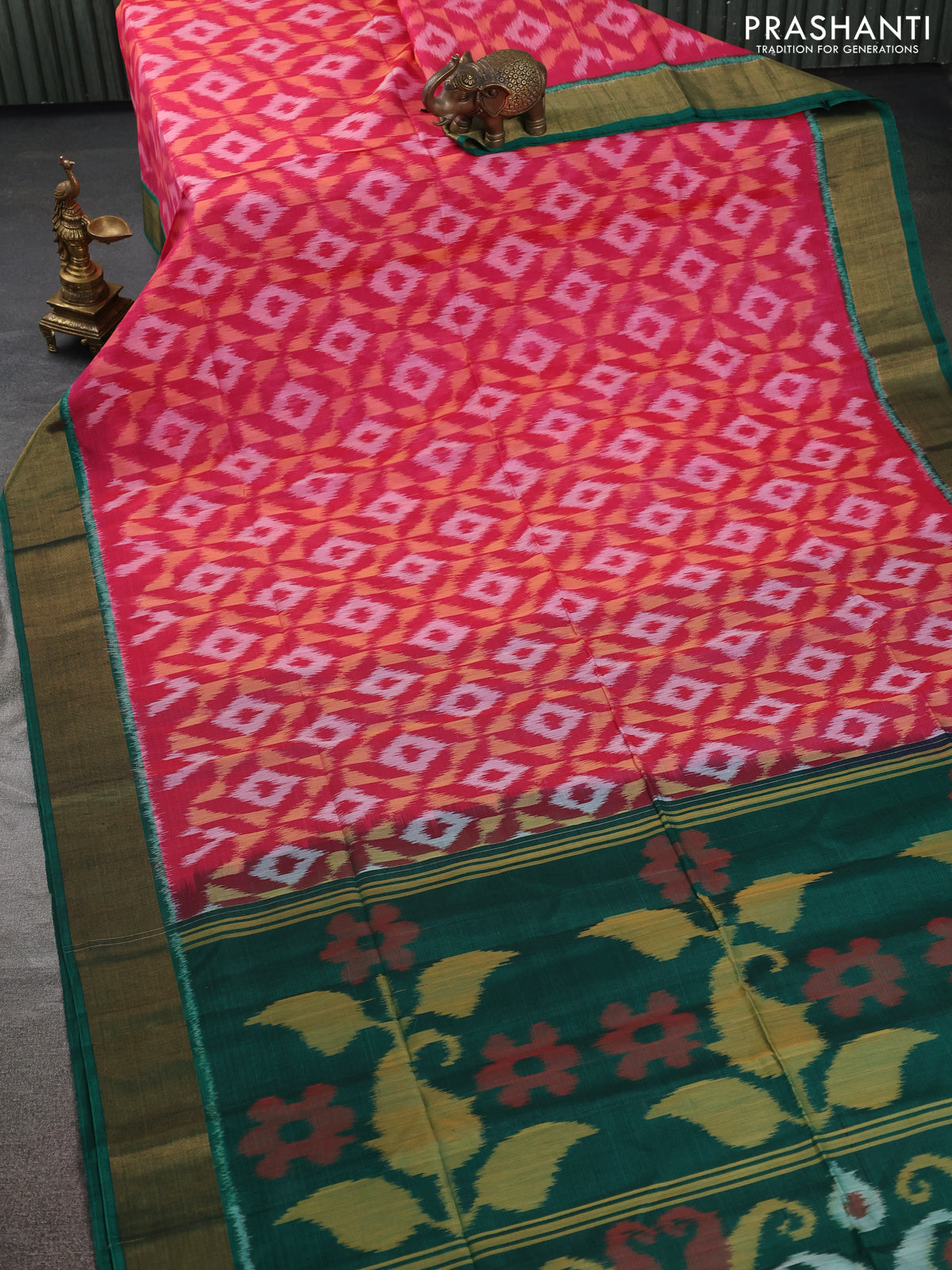 Ikat silk cotton saree pink and green with allover ikat weaves and zari woven border