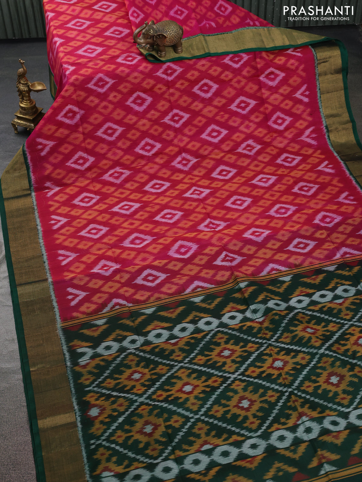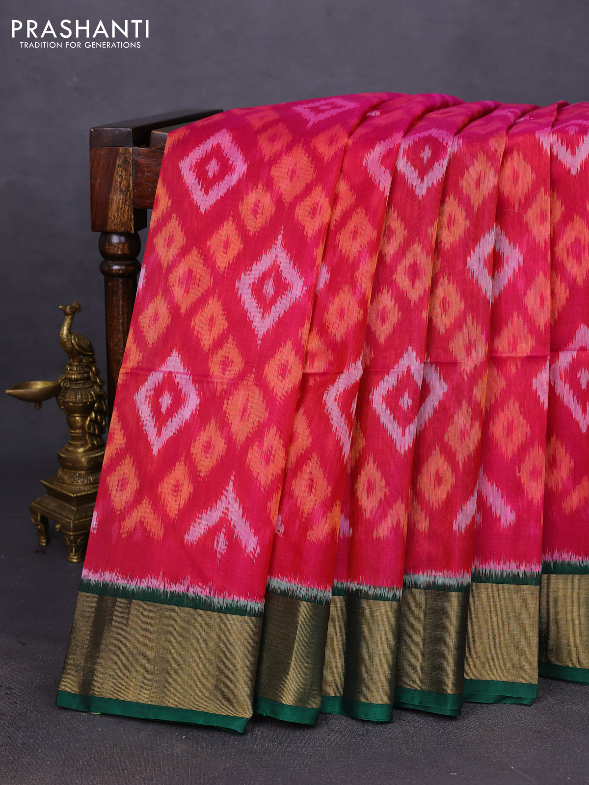 Ikat silk cotton saree pink and green with allover ikat weaves and zari woven border