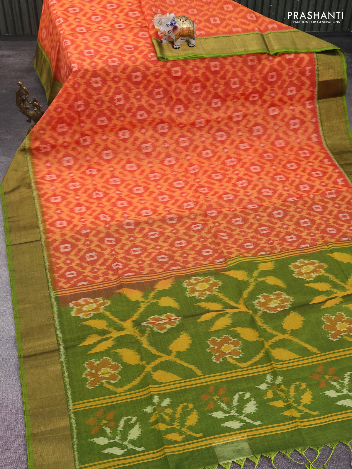 Ikat silk cotton saree rustic orange and light green with allover ikat weaves and zari woven border