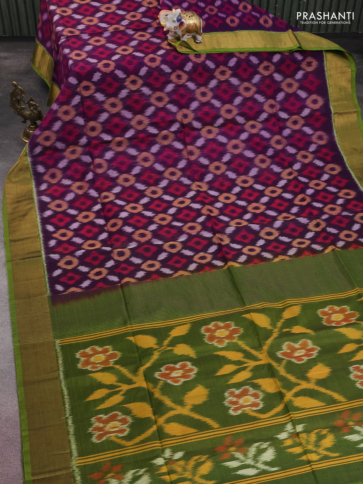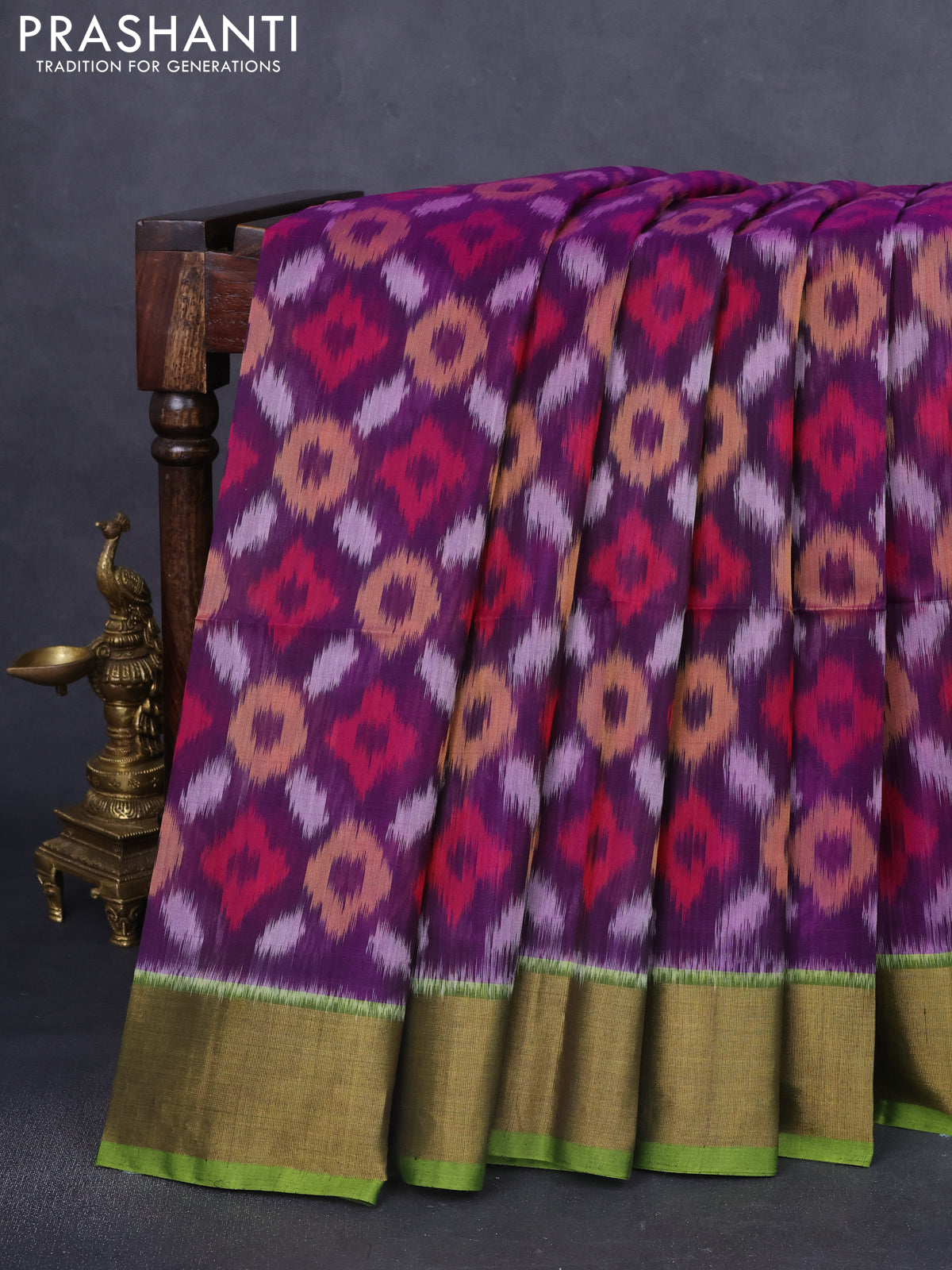 Ikat silk cotton saree violet and green with allover ikat weaves and zari woven border