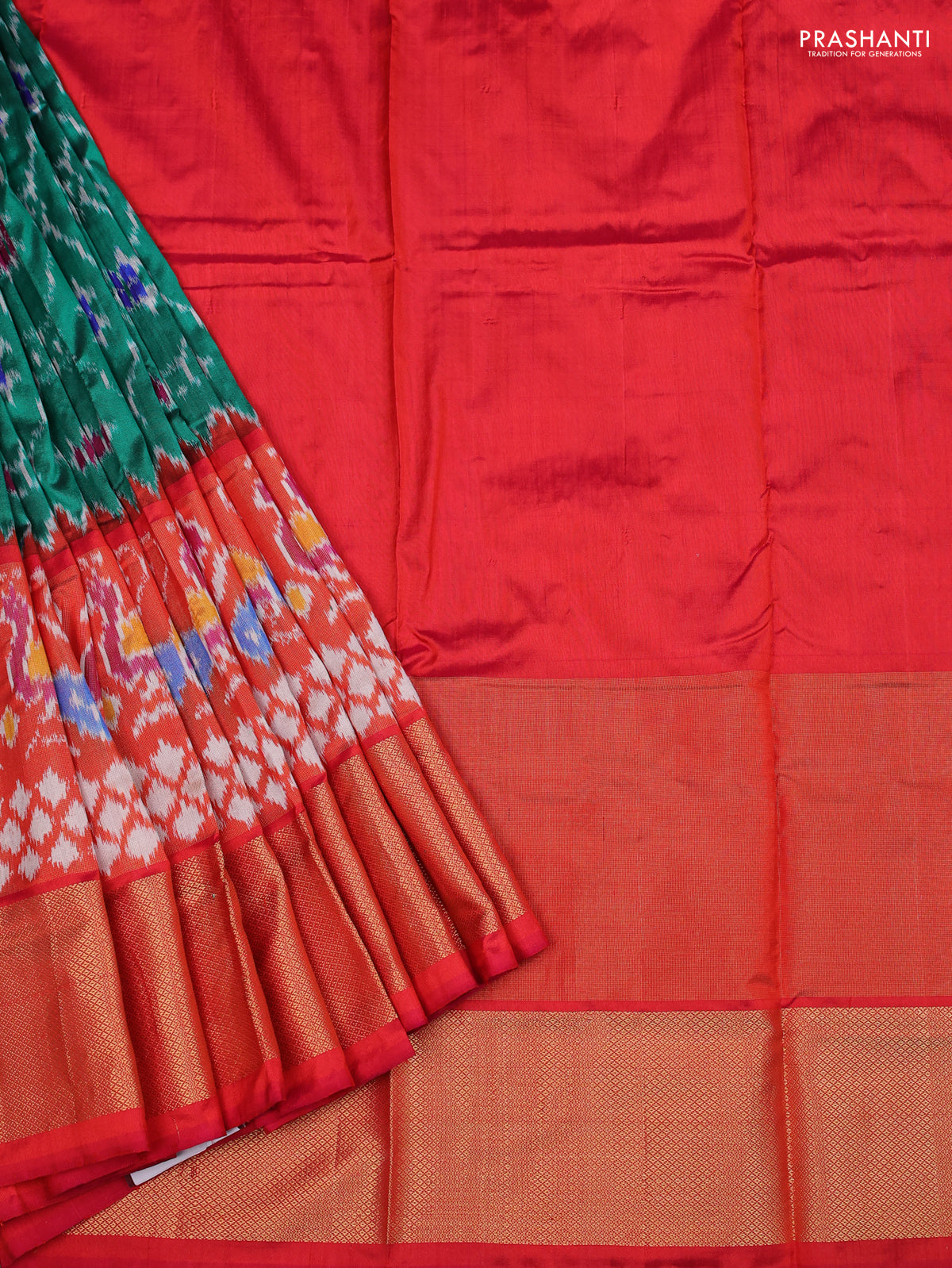 Ikat silk kids lehenga green and dual shade of pinkish orange with allover ikat weaves and long ikat woven zari border