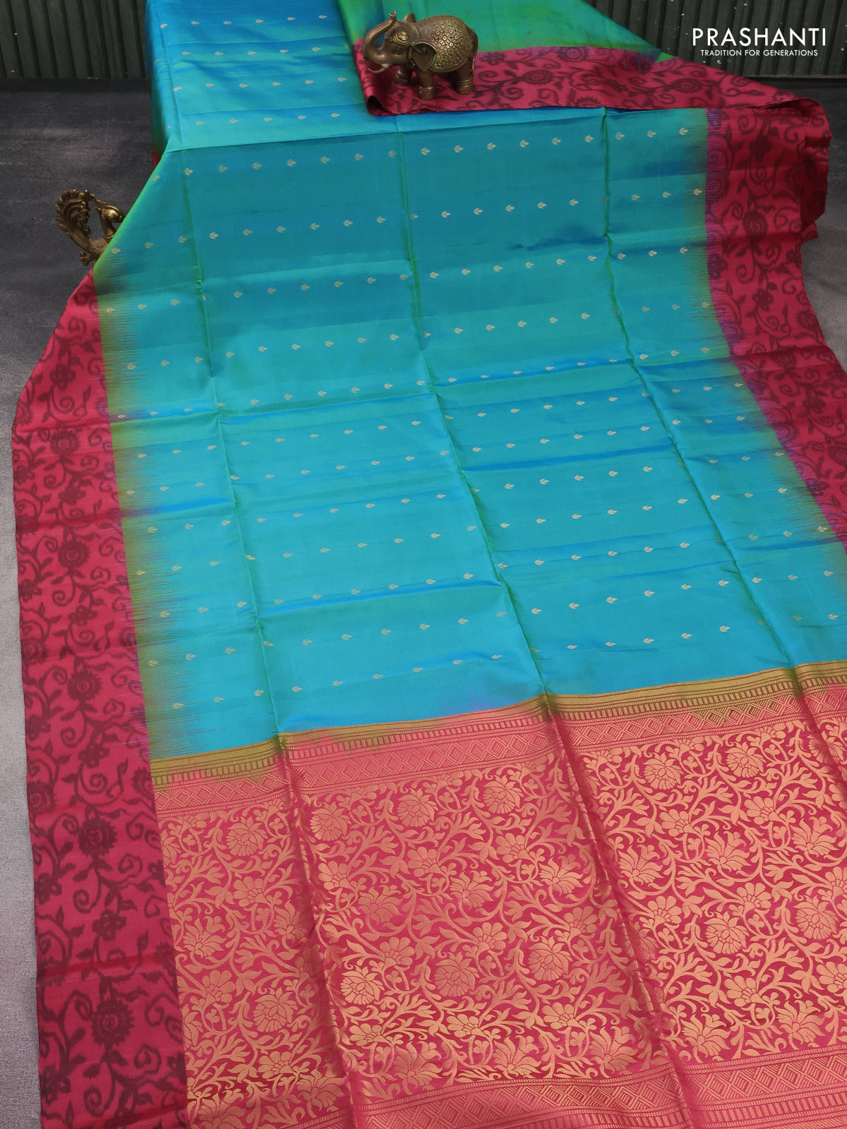 Ikat soft silk saree dual shade of teal bluish green and pink shade with allover zari woven buttas and ikat style border