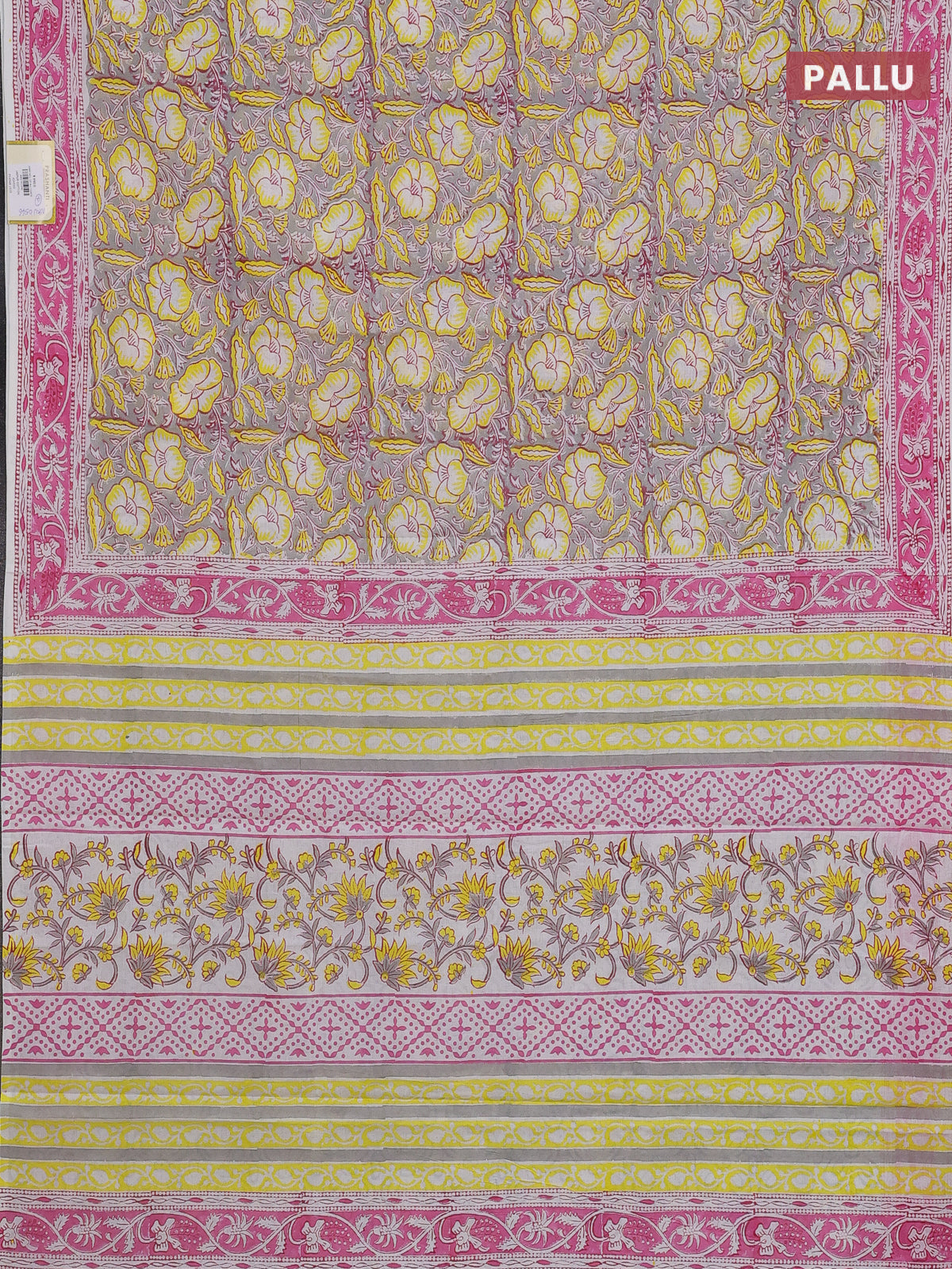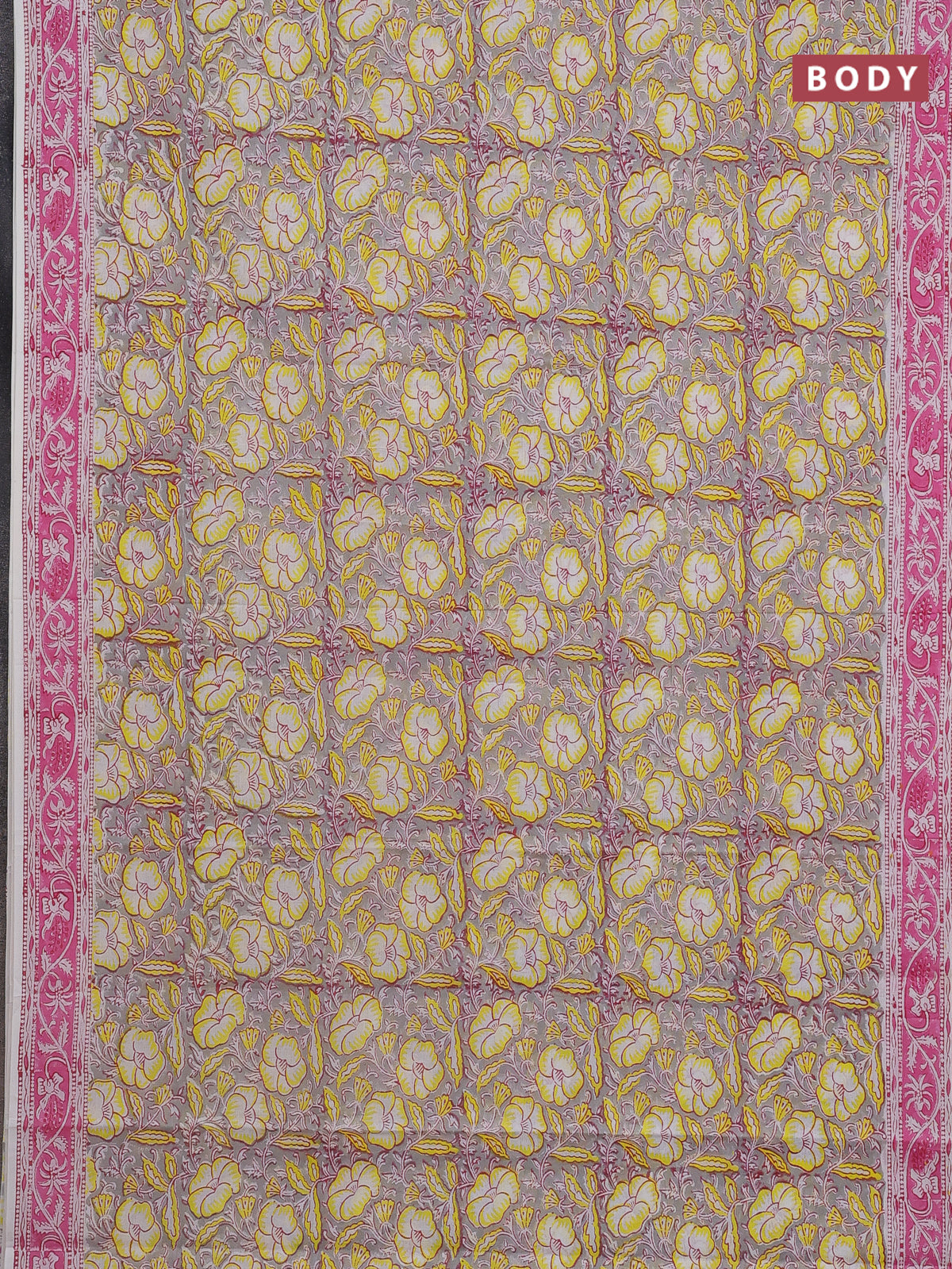 Jaipur cotton saree grey and pink with allover floral prints and printed border