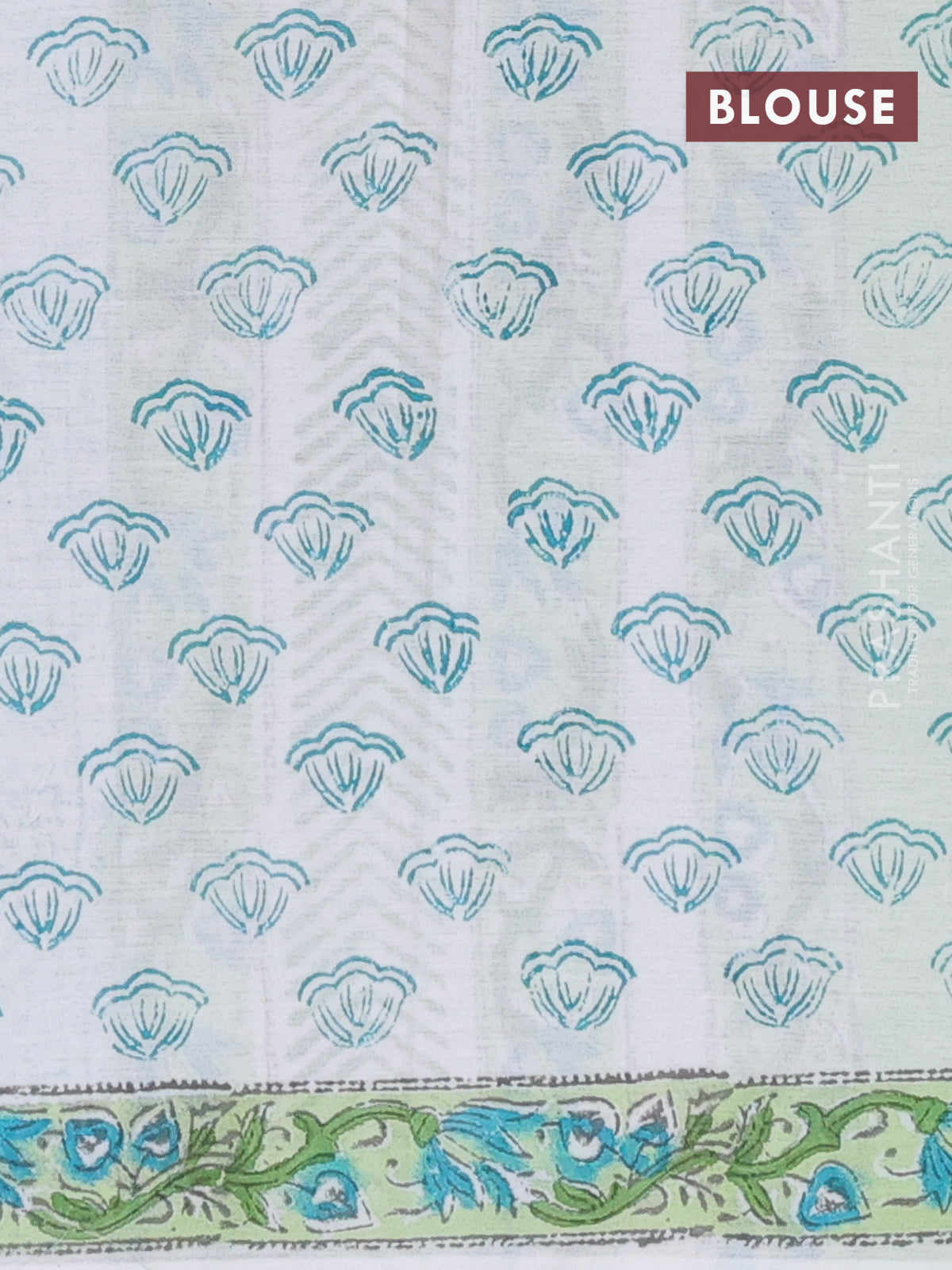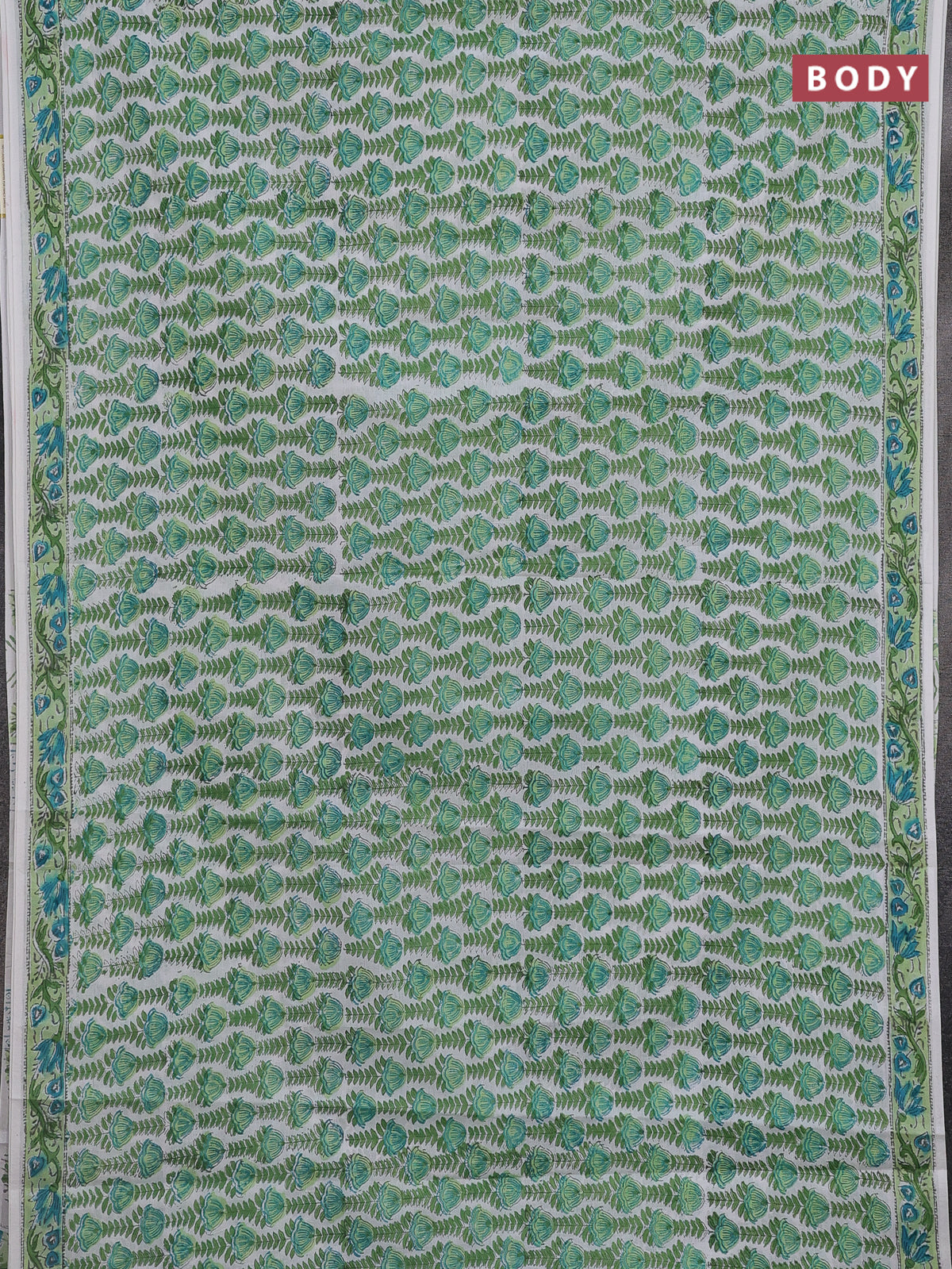 Jaipur cotton saree off white and green with allover floral prints and printed border