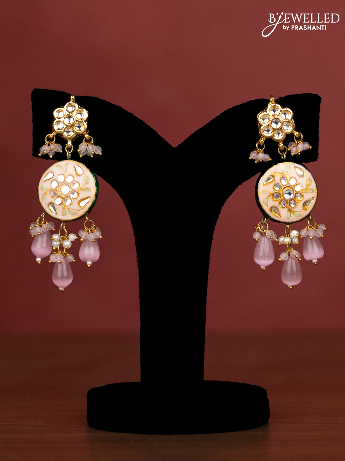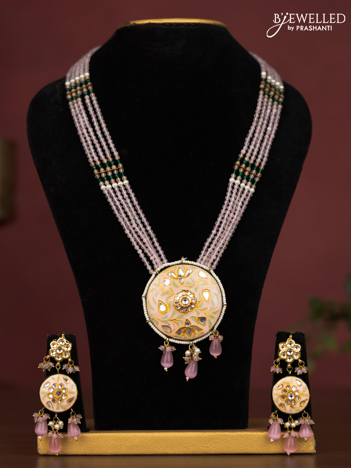 Jaipur crystal beaded baby pink length necklace with minakari pendant and hangings