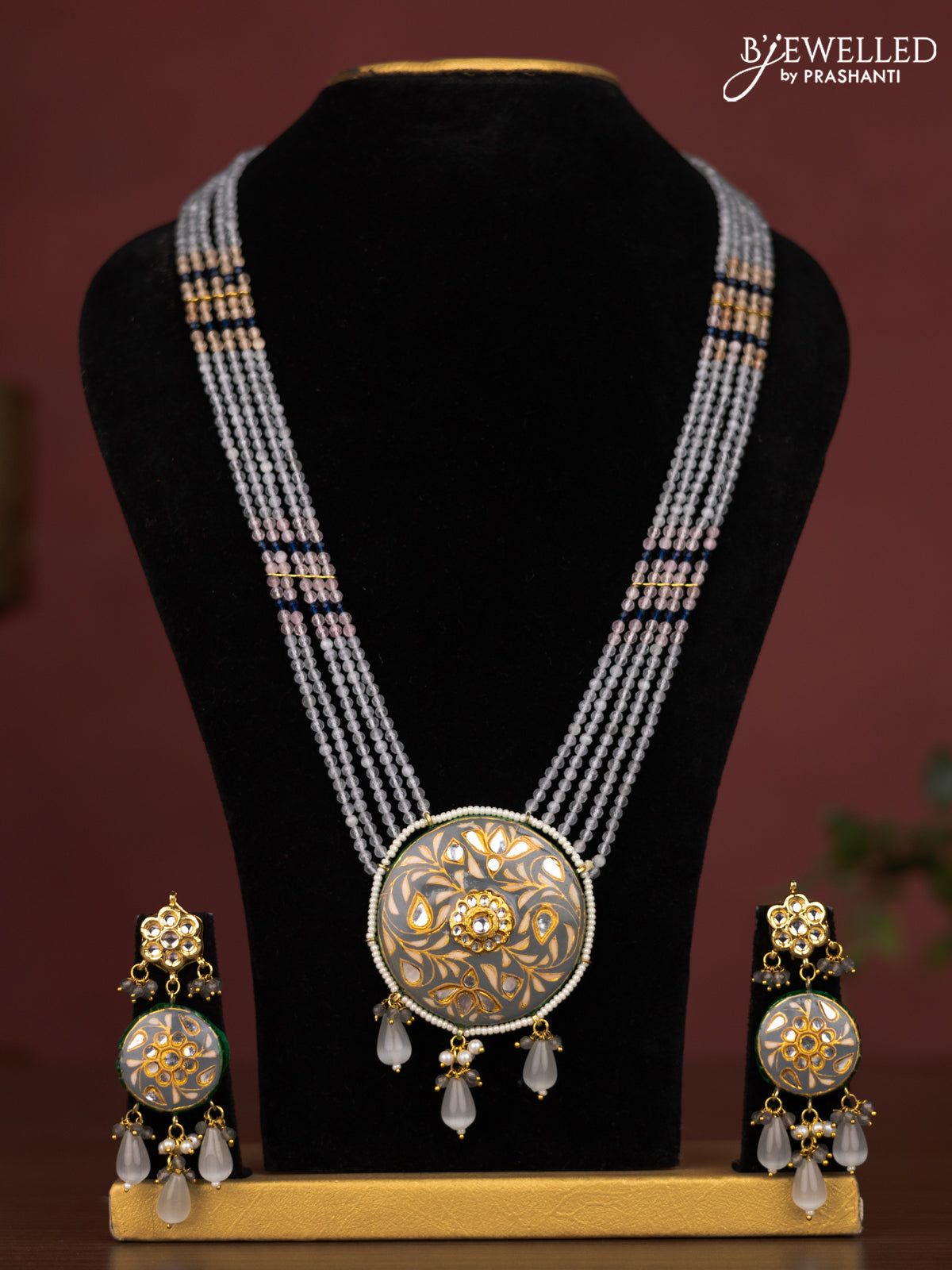 Jaipur crystal beaded grey length necklace with minakari pendant and hangings