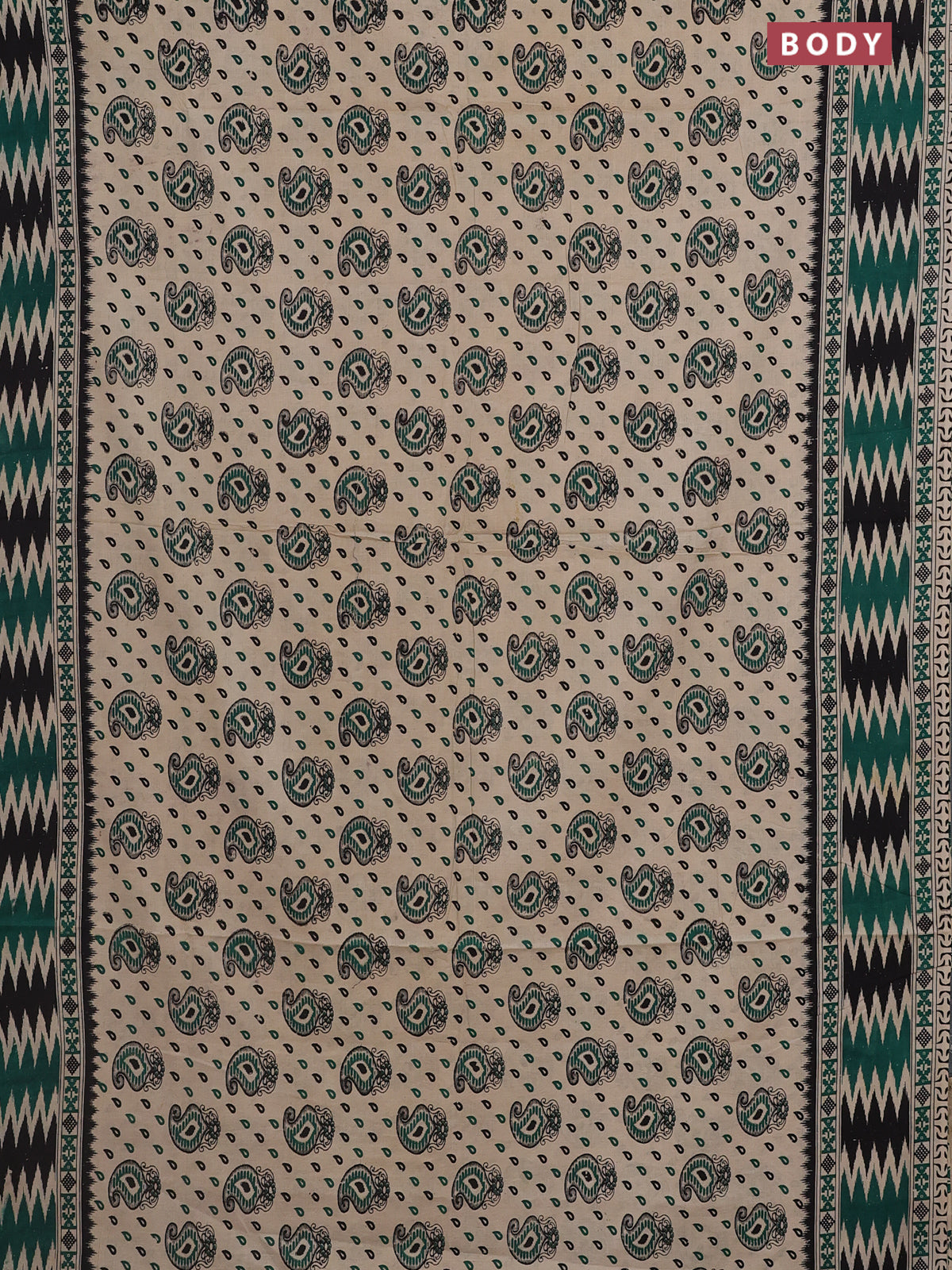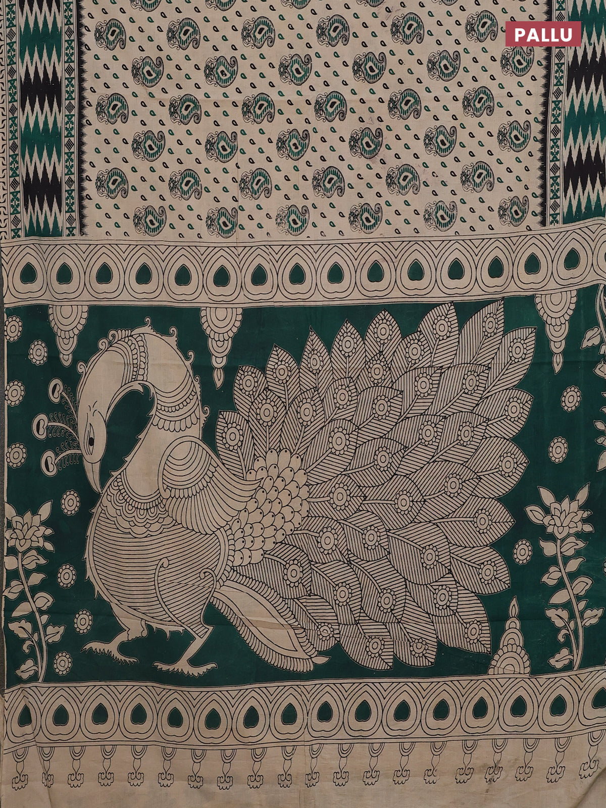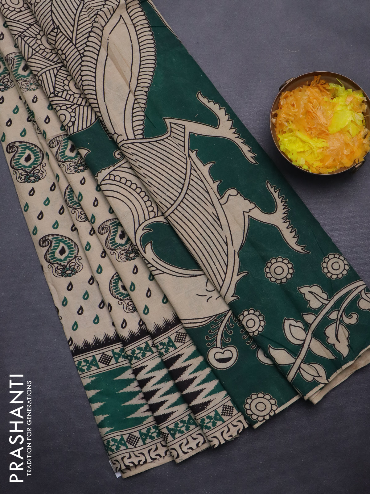 Kalamkari cotton saree beige and green with allover paisley butta prints and printed border