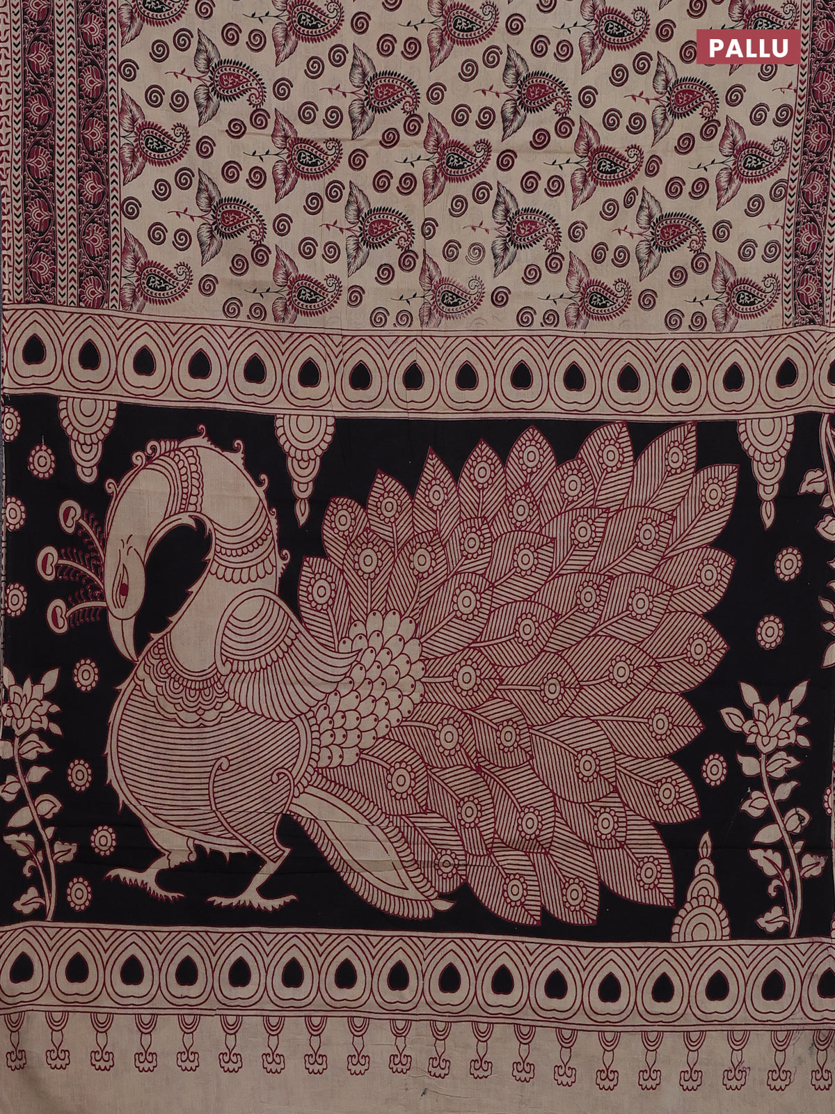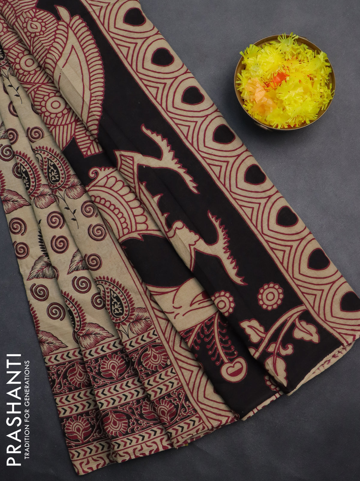 Kalamkari cotton saree beige and maroon with allover prints and printed border