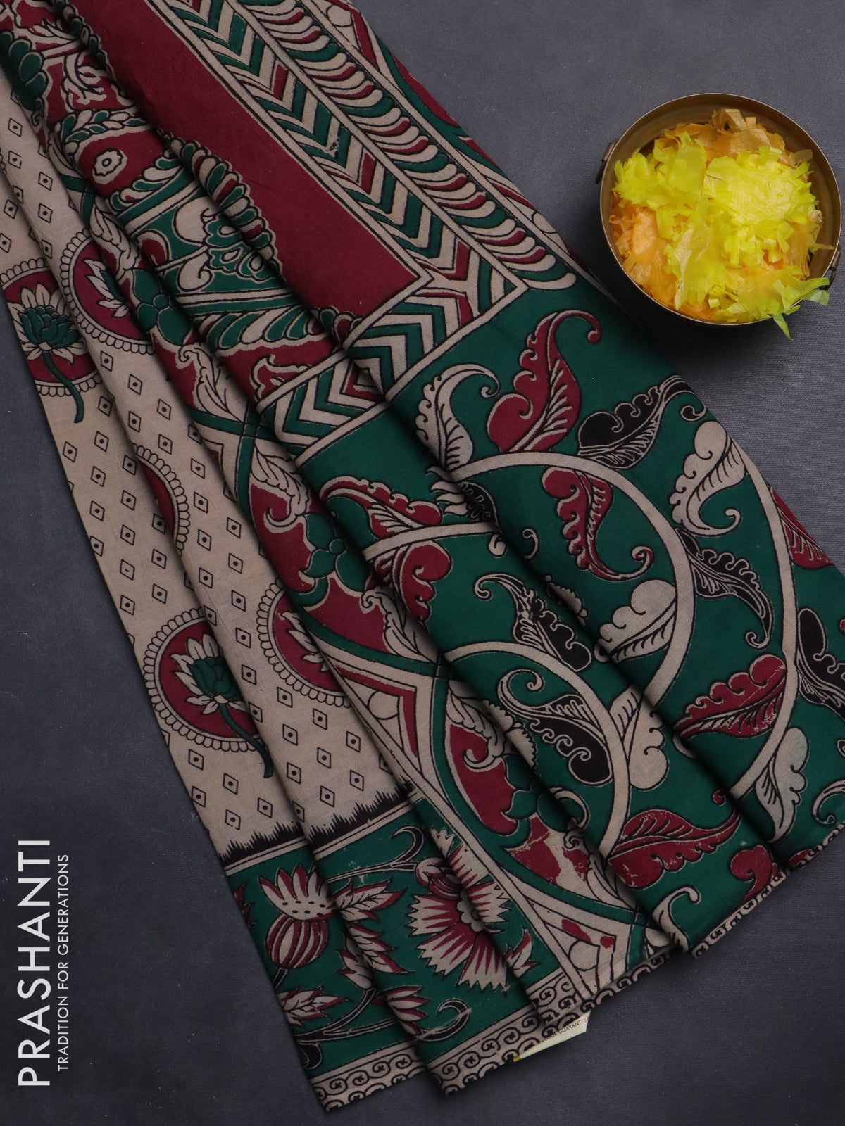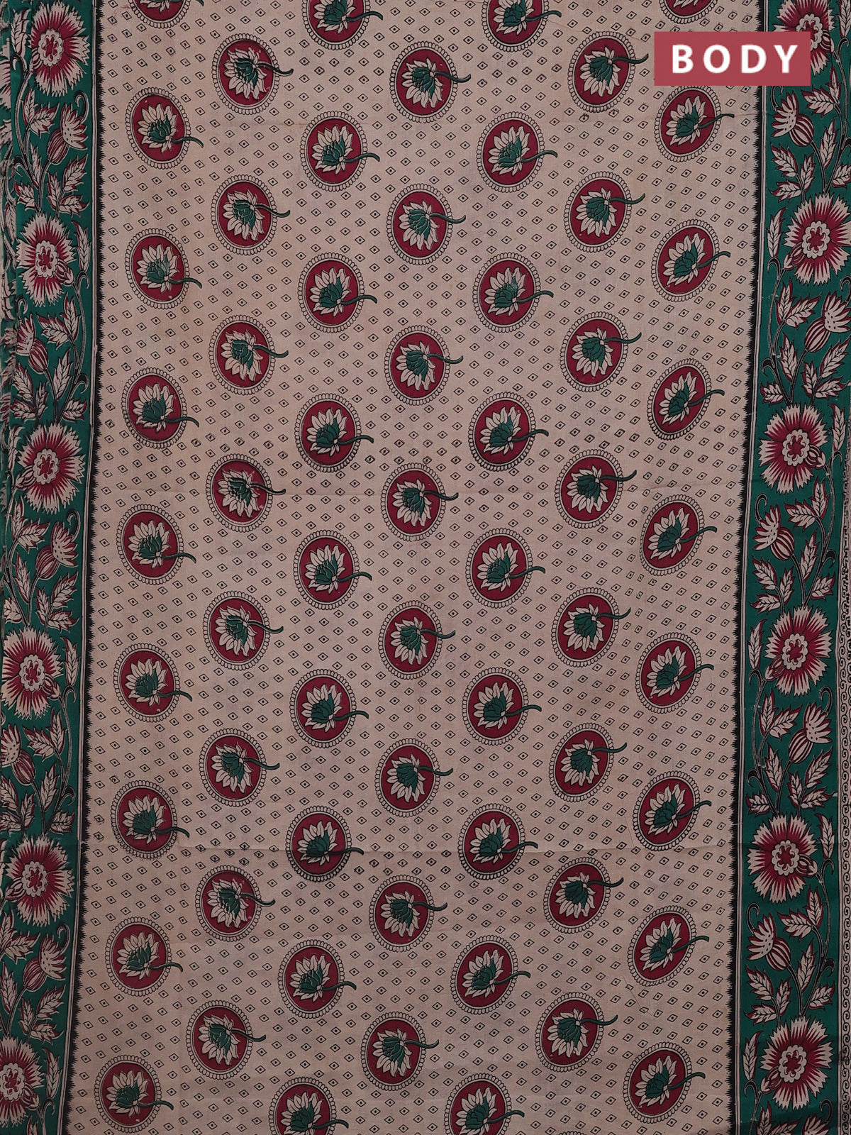 Kalamkari cotton saree beige and teal green with butta prints and printed border