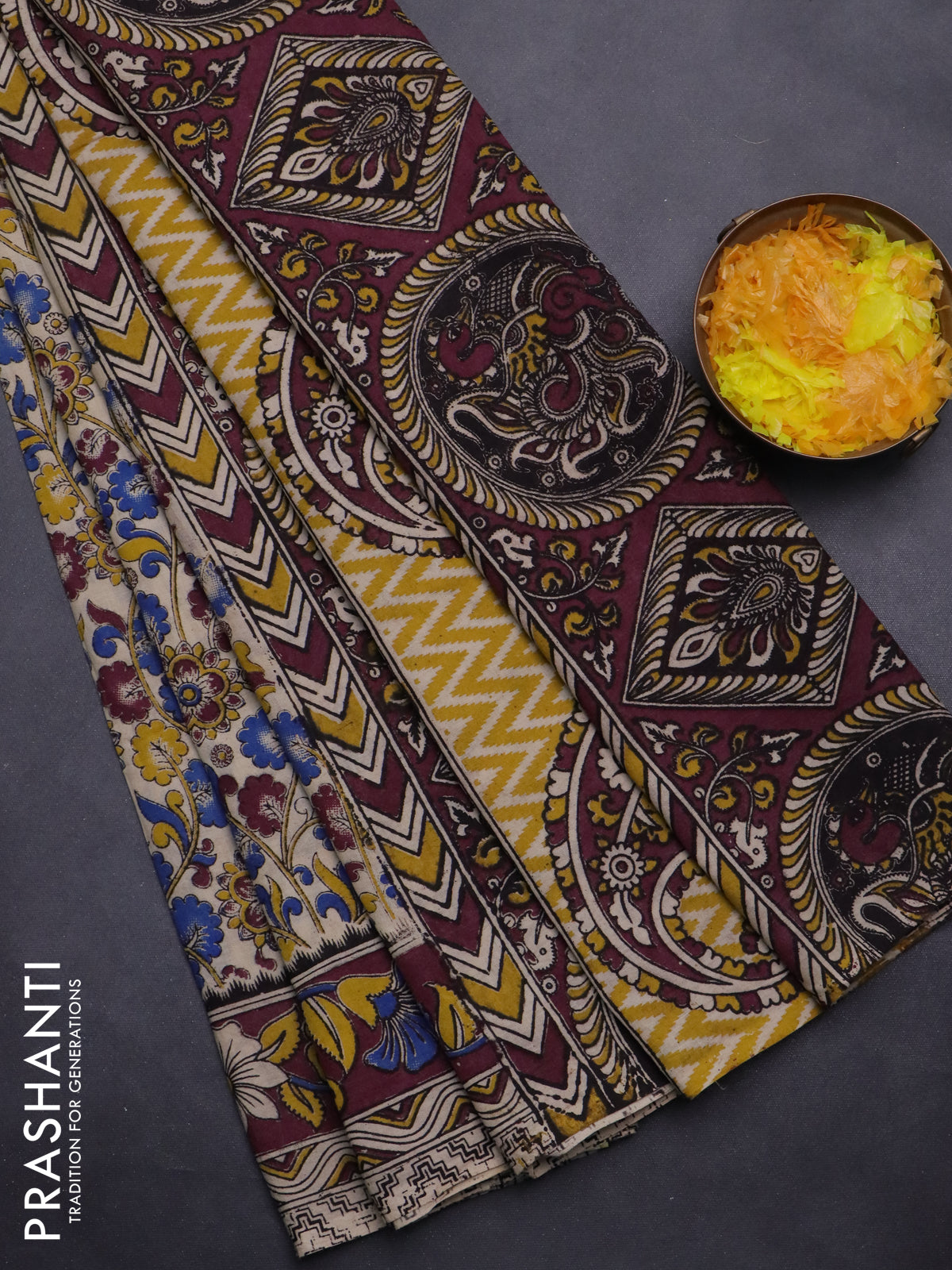 Kalamkari cotton saree beige and wine shade with allover prints and printed border