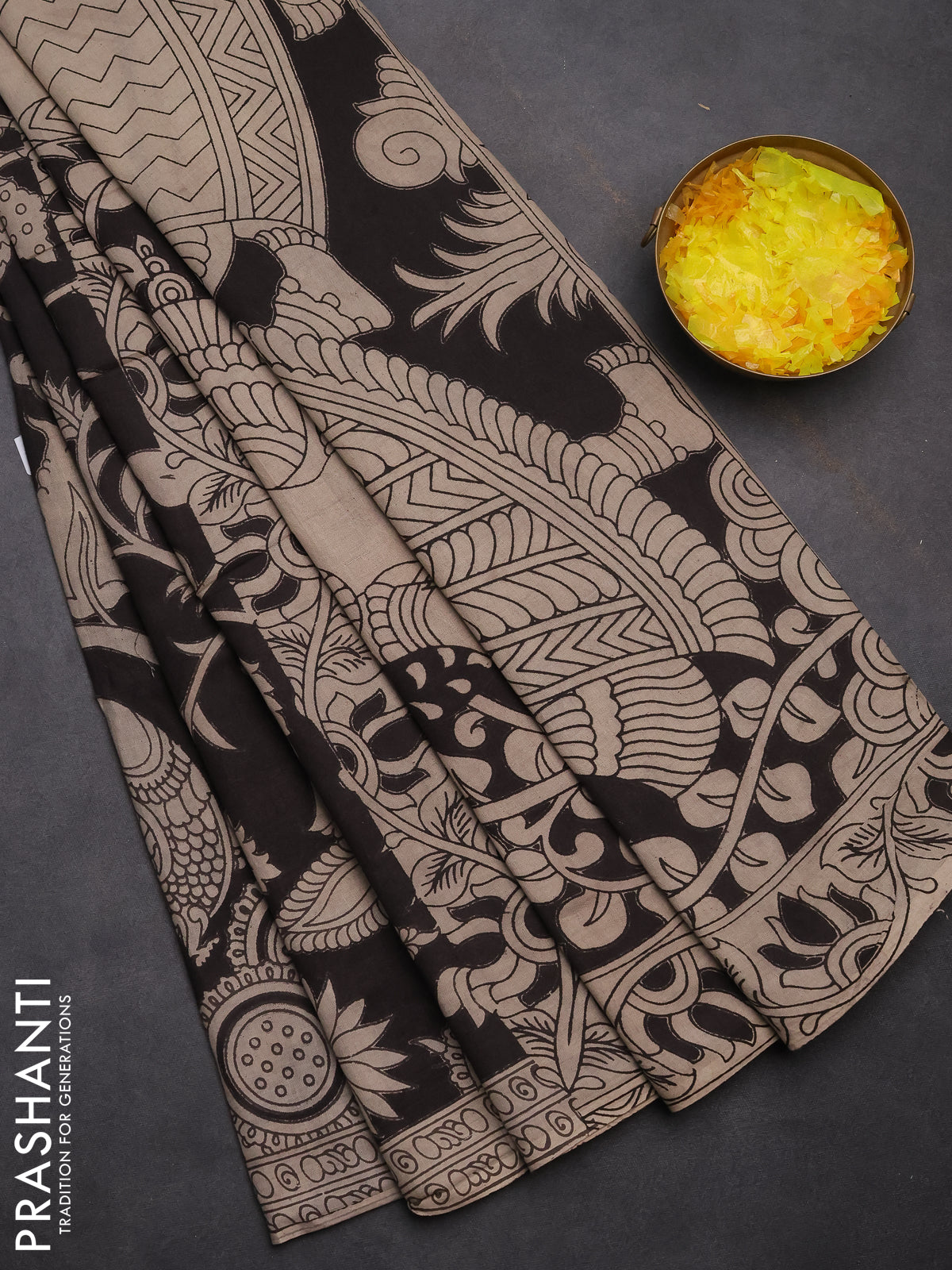 Kalamkari cotton saree black and beige with allover prints and printed border
