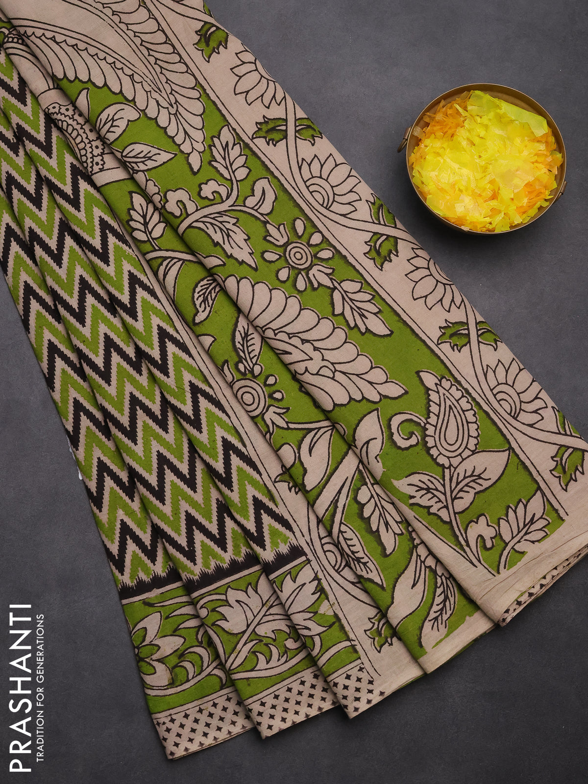 Kalamkari cotton saree black beige and light green with allover ikat prints and printed border