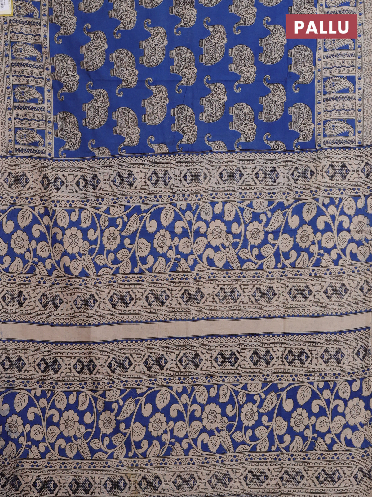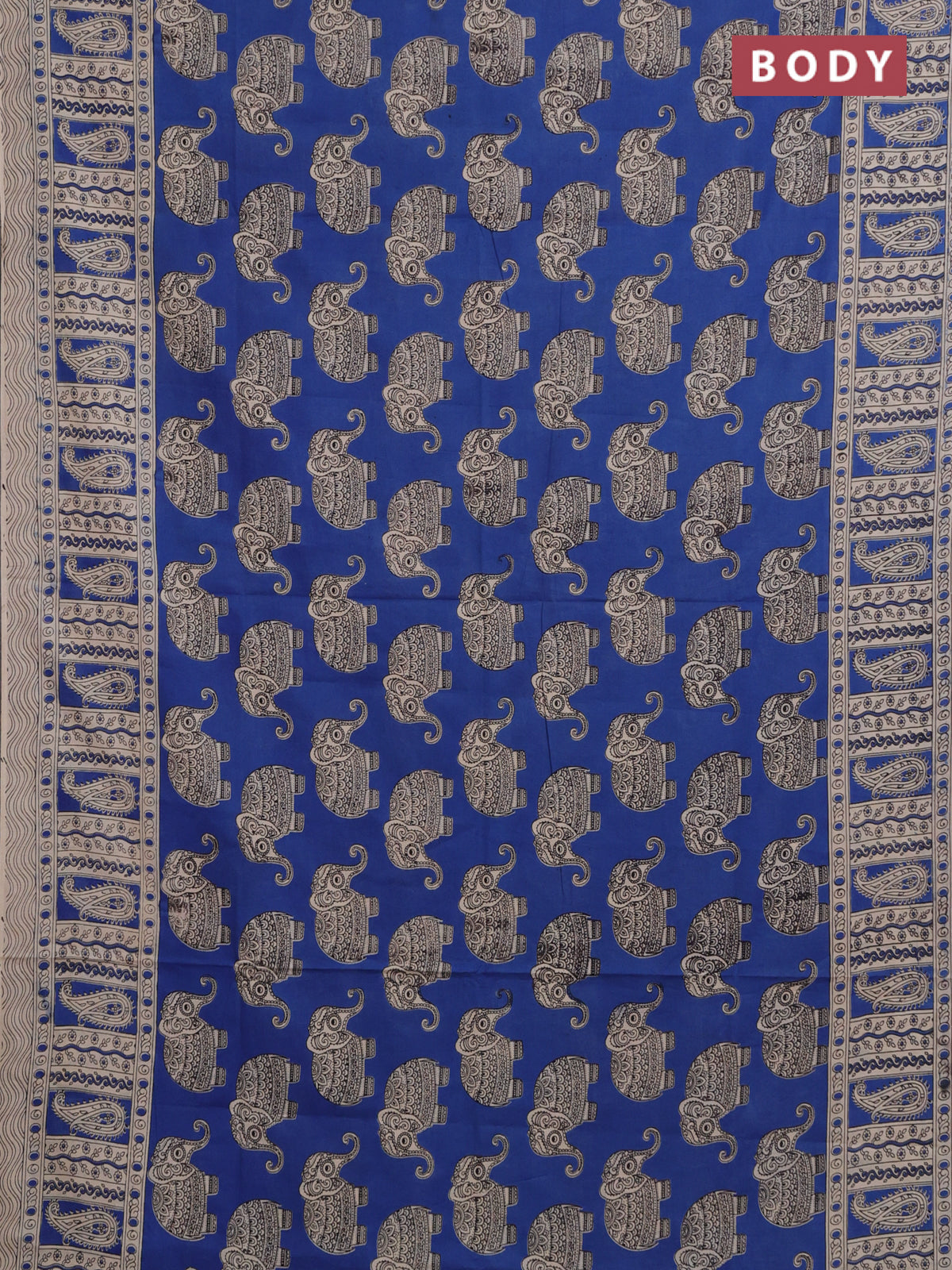 Kalamkari cotton saree blue and beige with elephant butta prints and printed border
