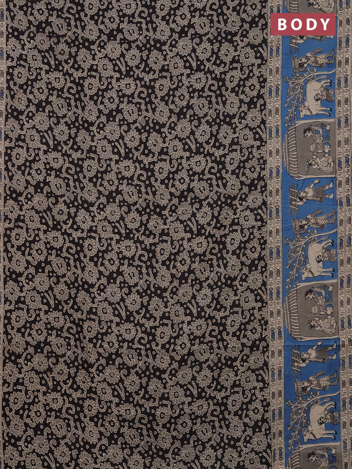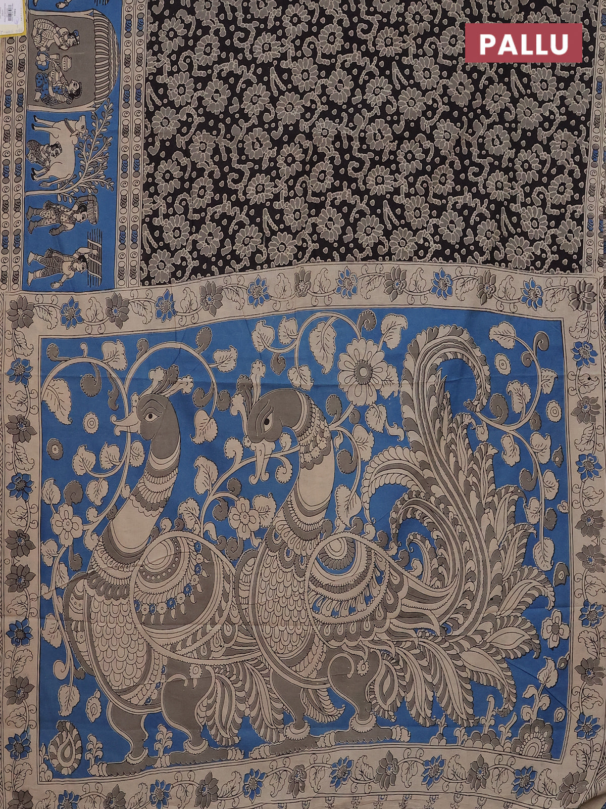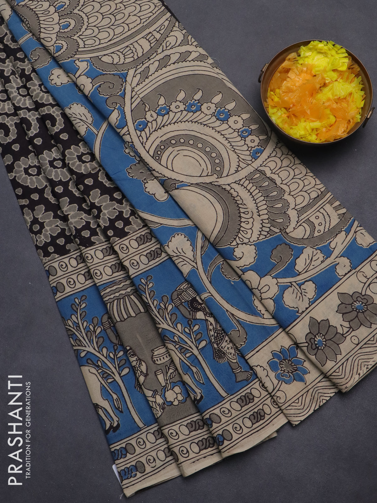 Kalamkari cotton saree coffee brown and cs blue with allover prints and printed border