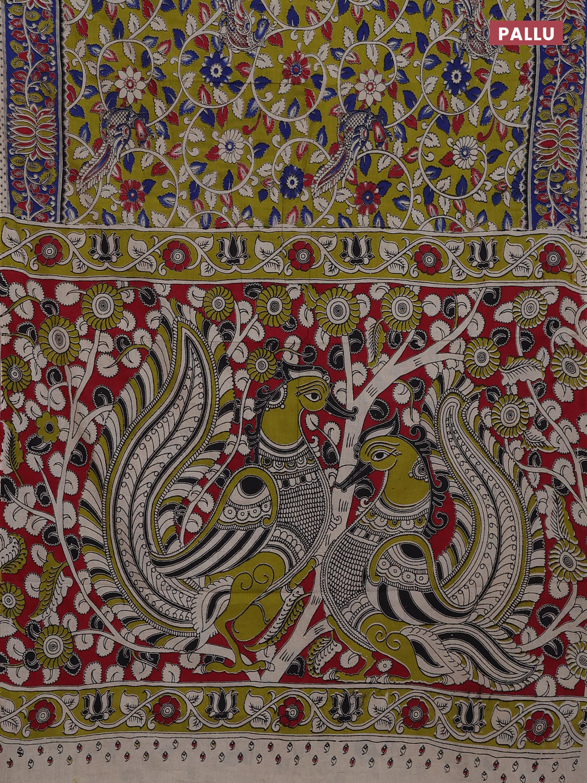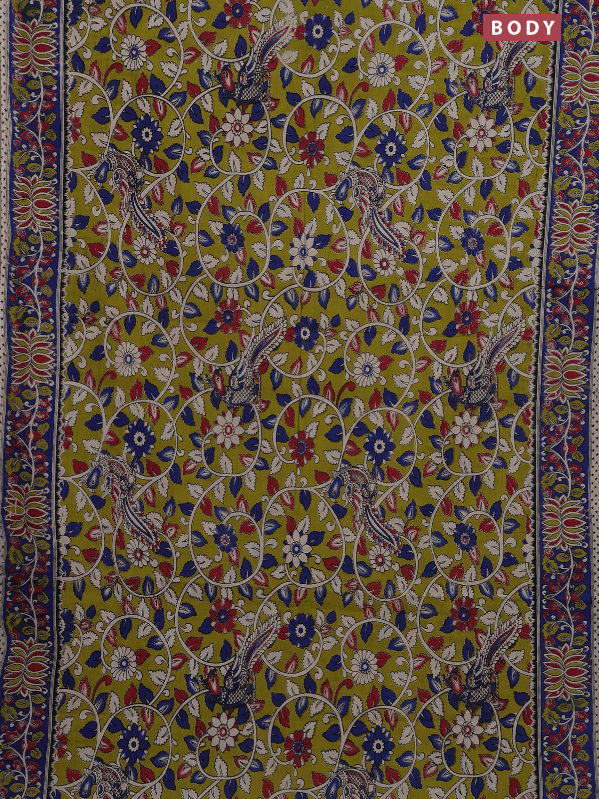 Kalamkari cotton saree lime green and blue with allover prints and printed border