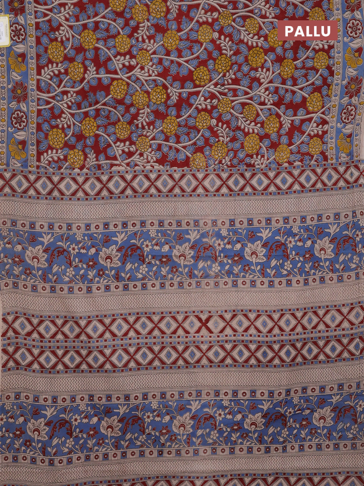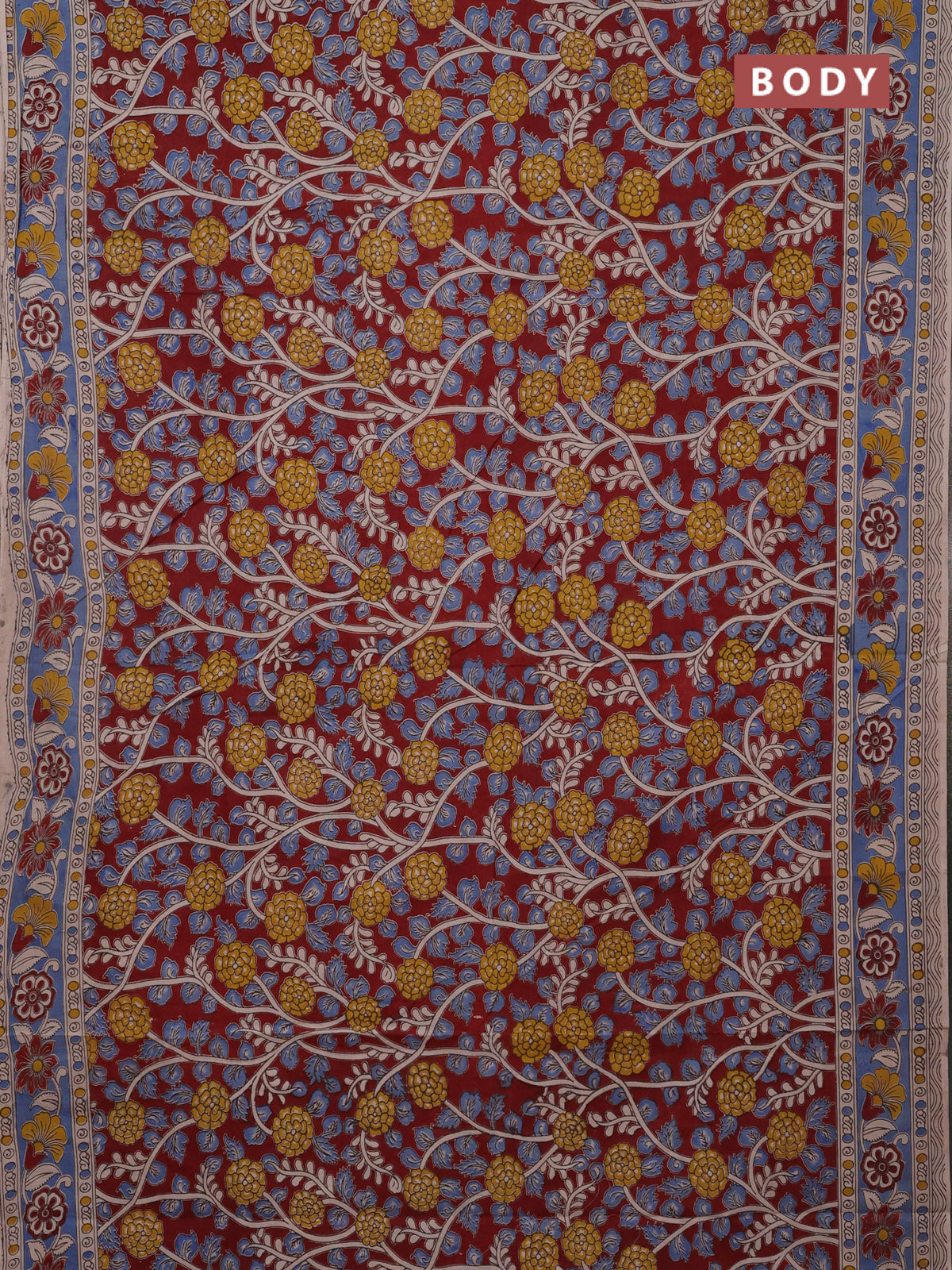 Kalamkari cotton saree maroon and blue with allover prints and printed border