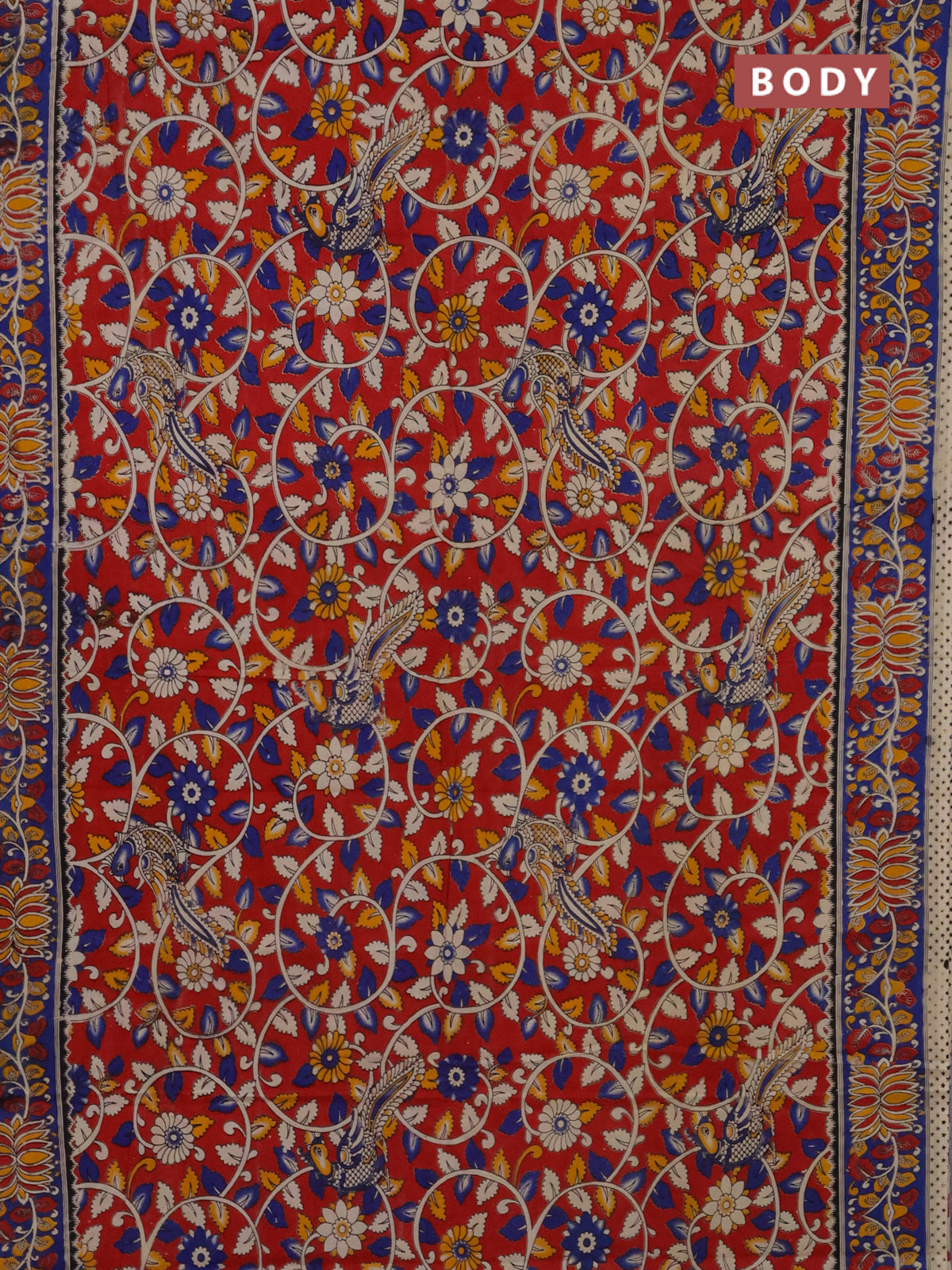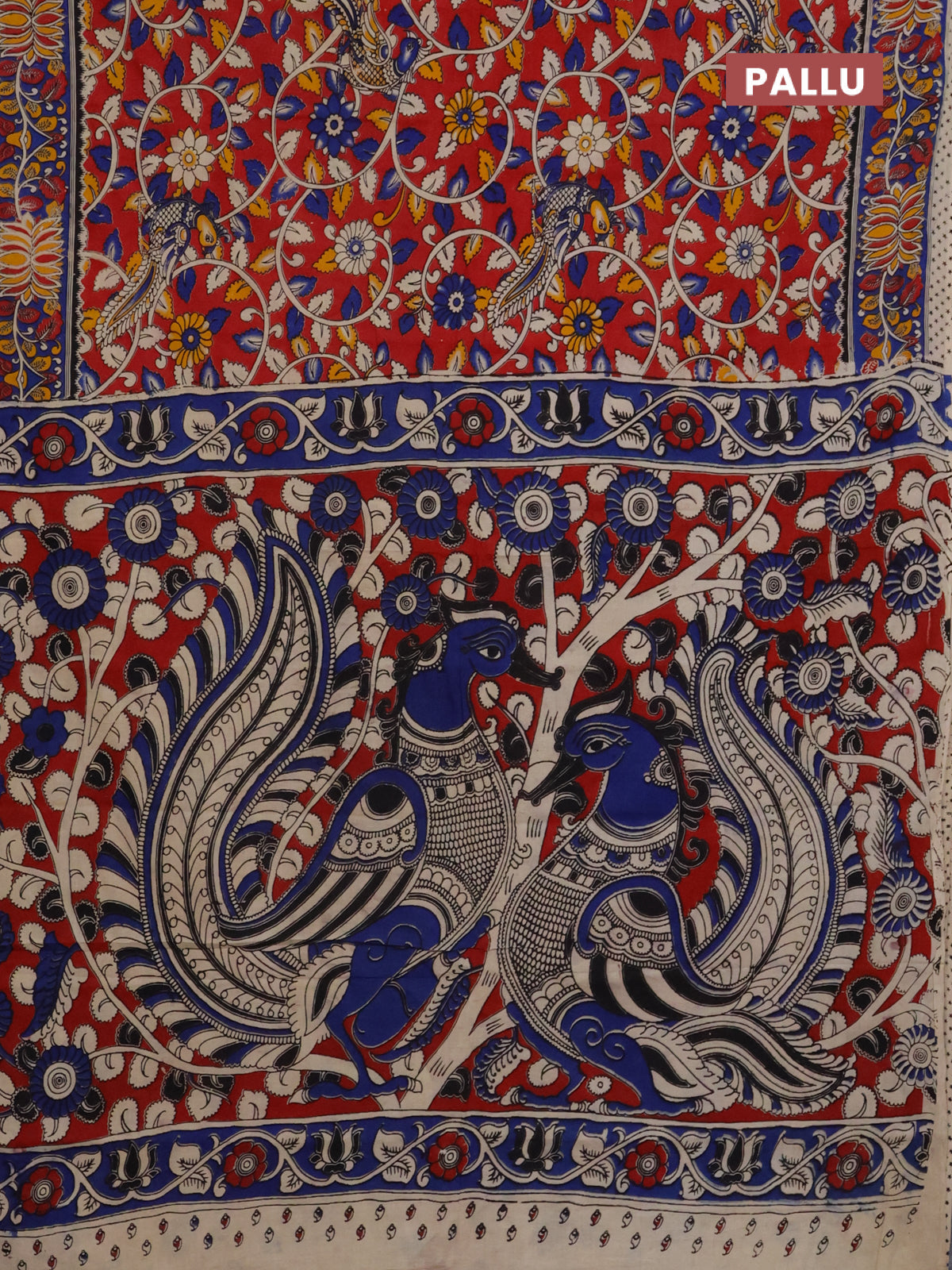 Kalamkari cotton saree maroon and blue with allover prints and printed border