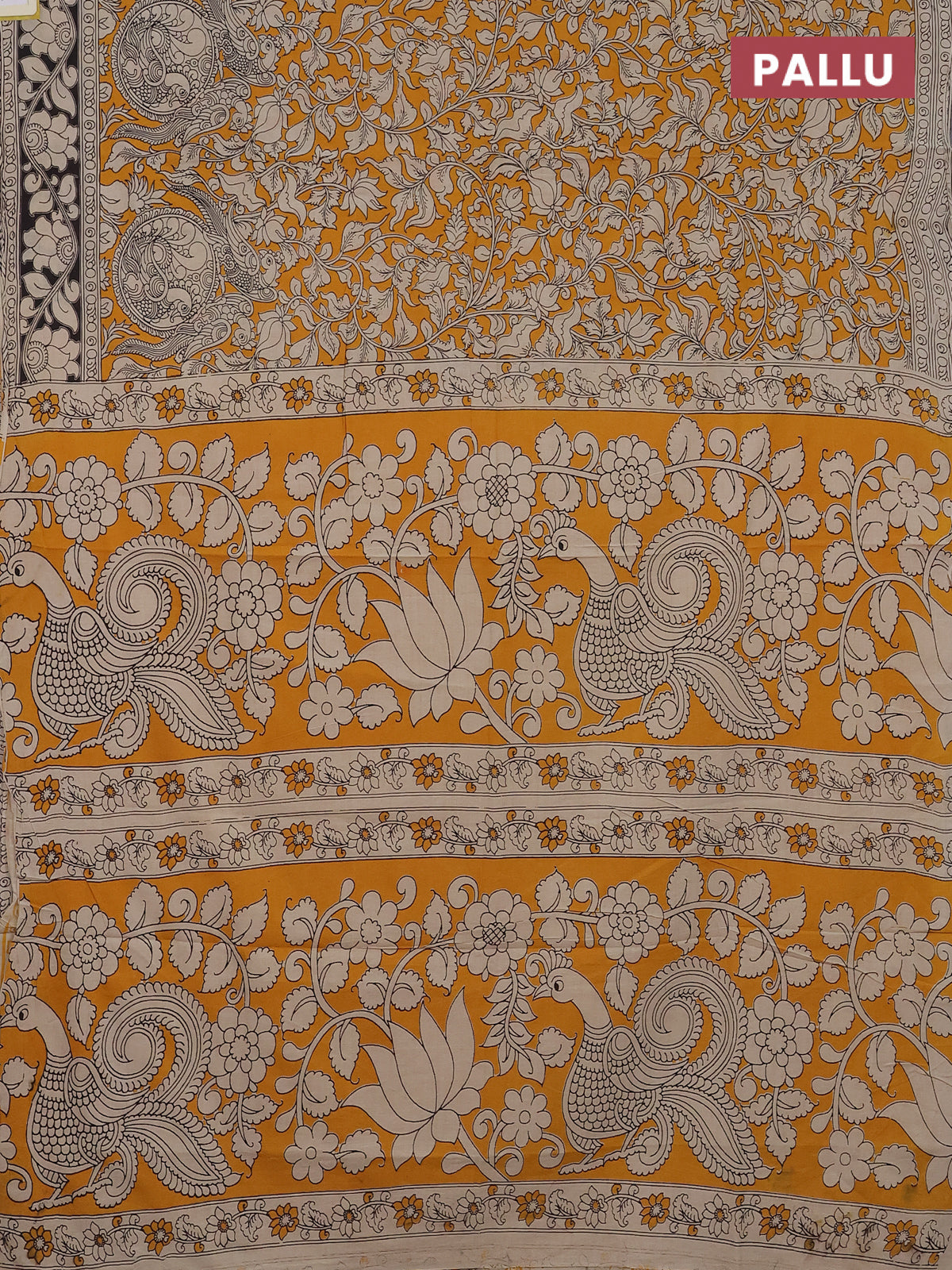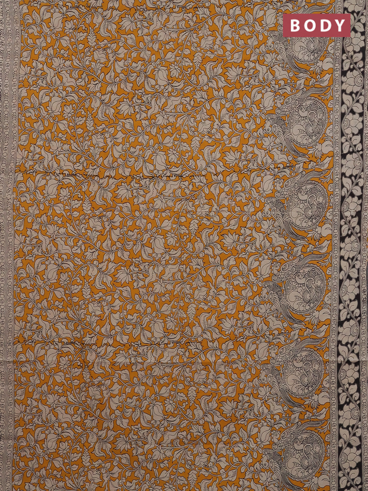 Kalamkari cotton saree yellow and black with allover prints and printed border