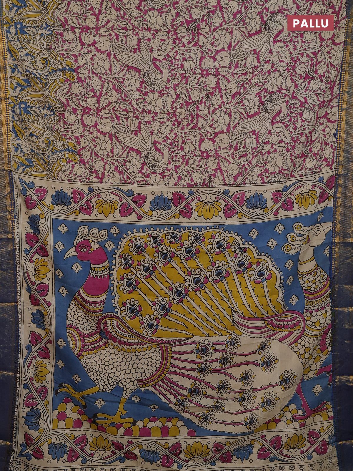 Kalamkari semi silk saree pink and blue with allover kalamkari prints and mangalgiri border