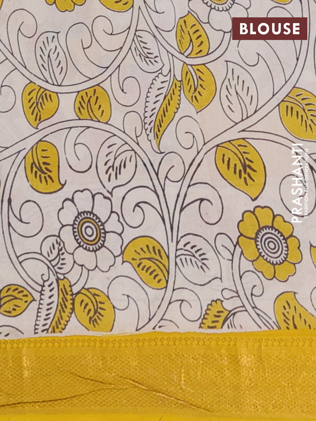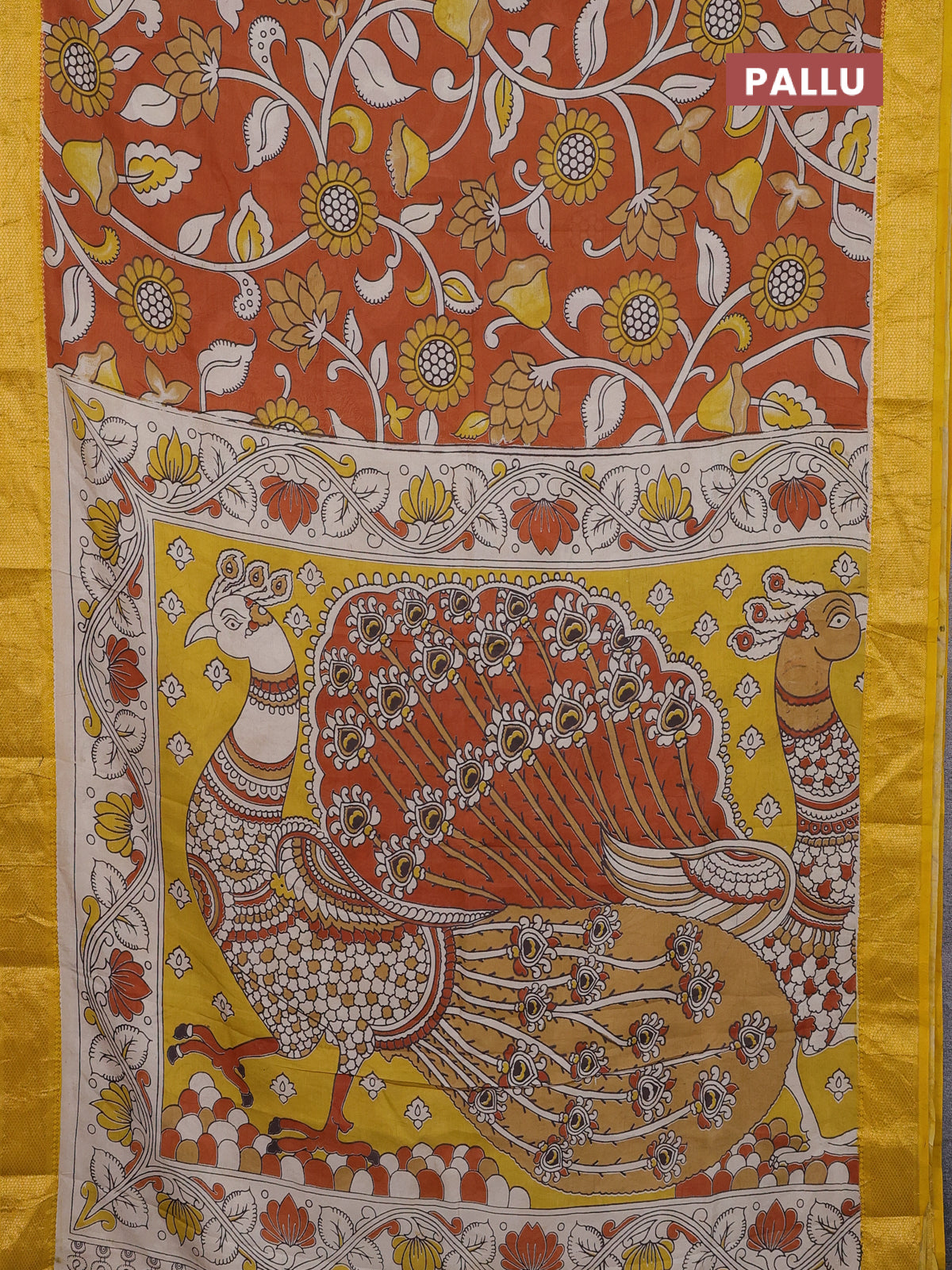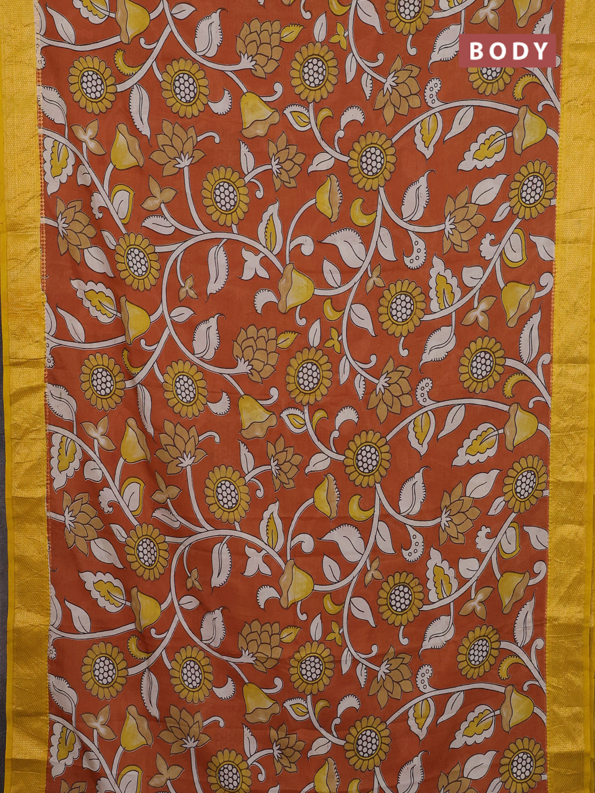 Kalamkari semi silk saree rust shade and yellow with allover prints and zari woven border