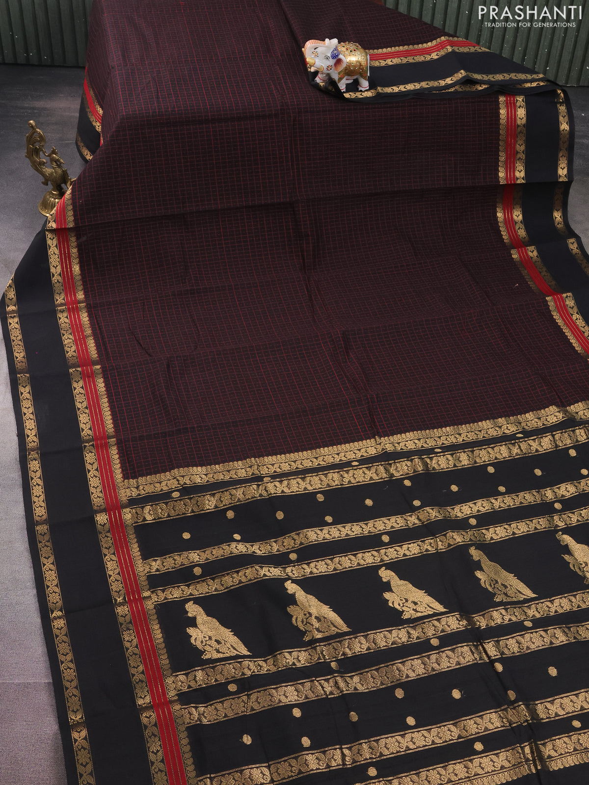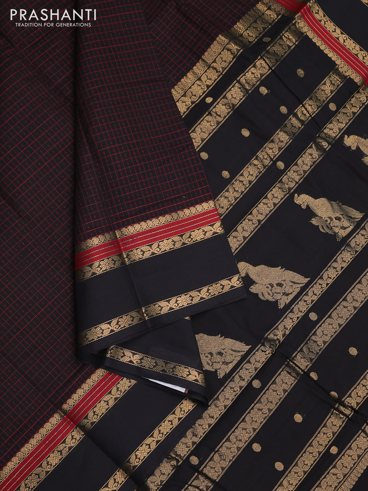 Kanchi cotton saree black with allover thread checked pattern & lakshadeepam weaves and rettapet zari woven border